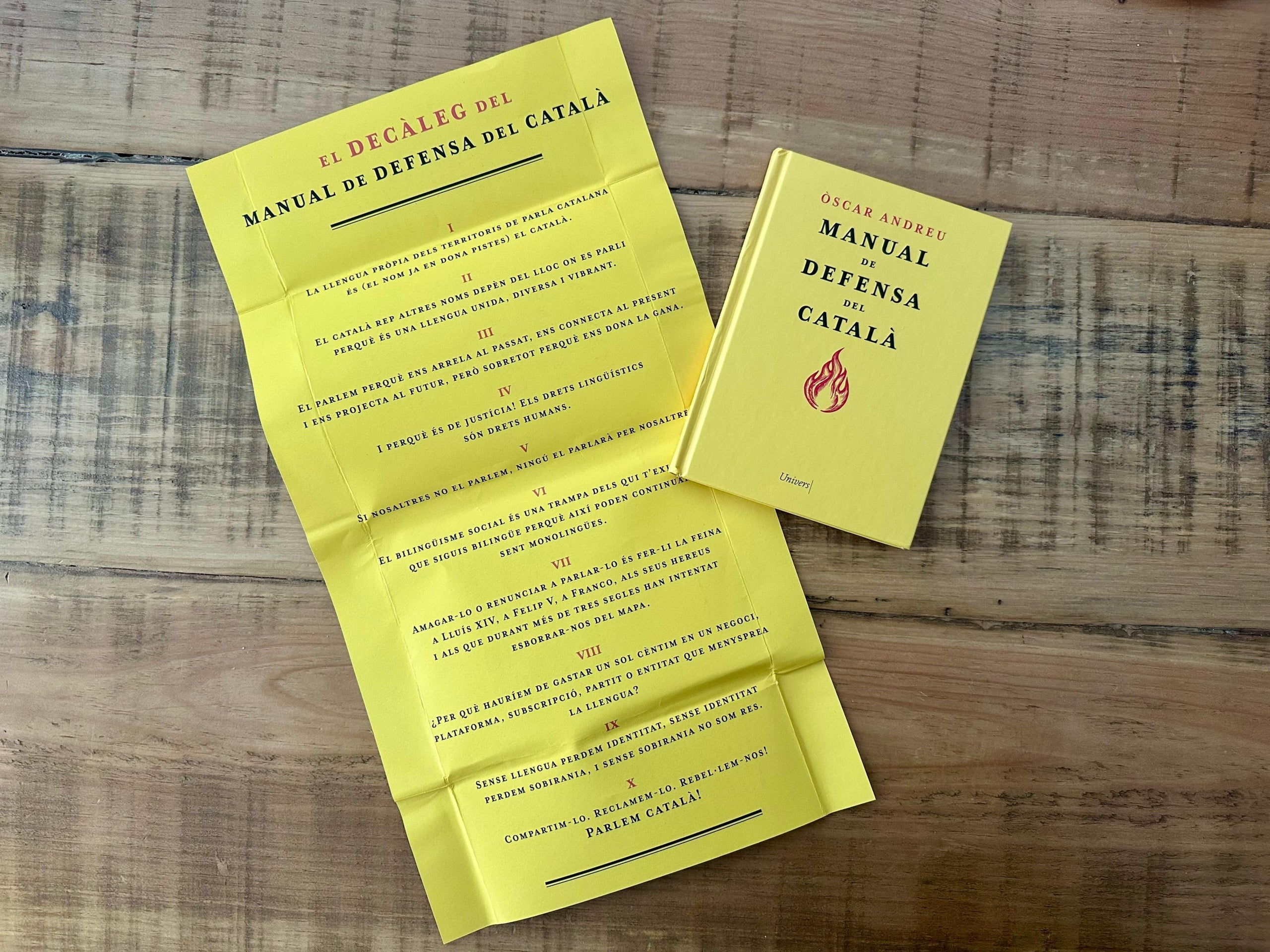 L’humorista i comunicador terrassenc Òscar Andreu ha elaborat el Manual de defensa del català (Univers), un llibre que ben segur estarà entre els més venuts de no-ficció en català aquesta diada de Sant Jordi i que té un subtítol que defineix el llibre a la perfecció: “Sobre les aventures i desventures d’un catalanoparlant d’ascendència andalusa a la capital de Catalunya ben entrat el segle XXI i com topa de manera fortuïta amb la fórmula per salvar la llengua”. És a dir, aborda el jo, el nosaltres, l’ells i la decisió que pren el lector sobre la relació que decideix tenir amb la llengua després de llegir-lo. L’humorista analitza a través de l’humor la situació d’emergència lingüística que pateix el català amb l’objectiu que el lector reflexioni i desenvolupi una “consciència lingüística” vers el català perquè el “conflicte” amb la llengua “se soluciona si l’encares”. En cas contrari, “no s’acaba de solucionar mai i sempre queda soterrat”. Així ho assegura Andreu en una conversa amb El Món sobre el llibre, que en l’interior de la portada porta un decàleg per defensar la llengua. La voluntat és que la funció principal de l’obra sigui donar “eines per començar a plantar cara” i defensar la llengua. “Un acaba renunciant-hi fins que s’adona que perds més coses de les que guanyes renunciant al català”, reflexiona.