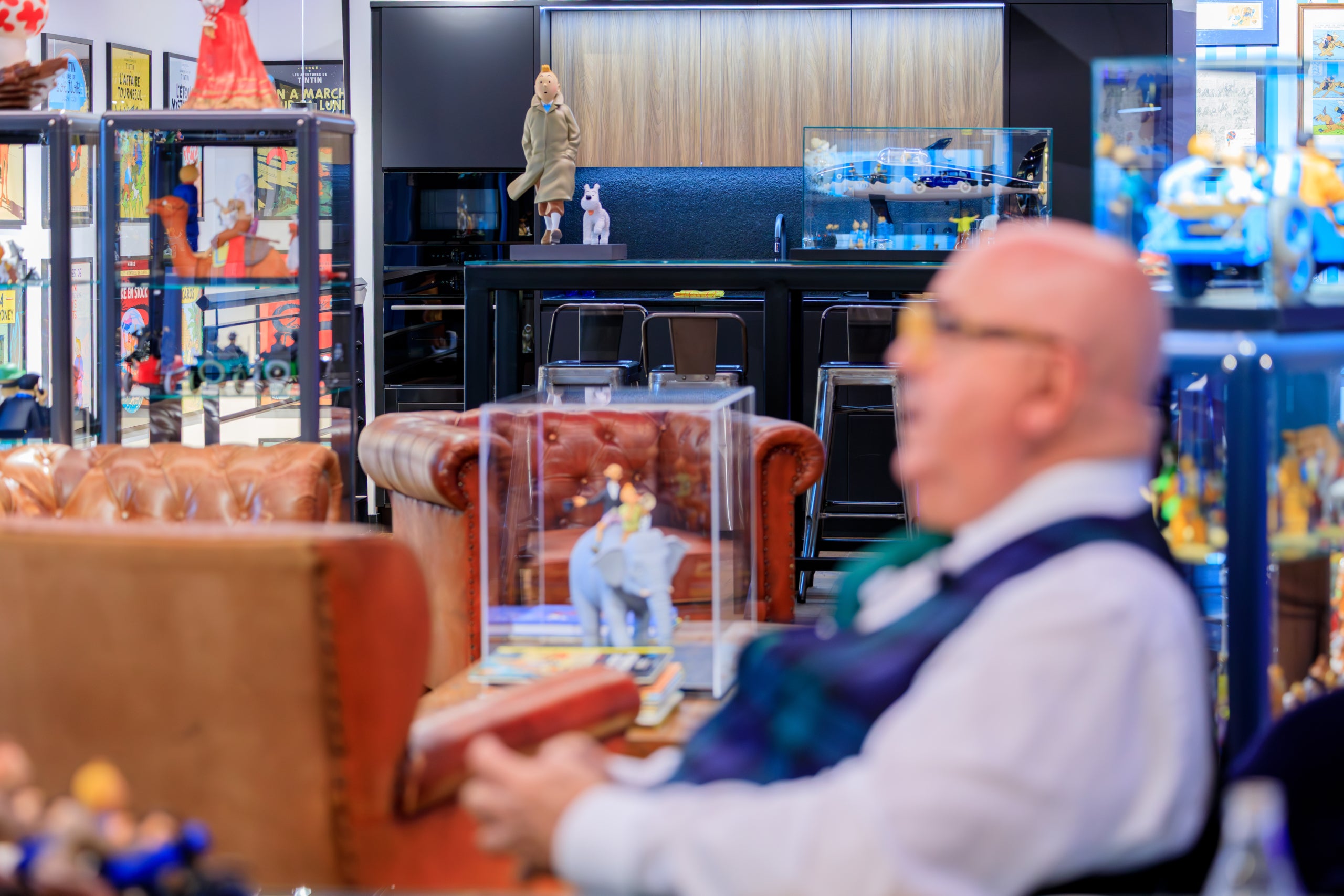 Seua és tota la il·lusió quan ha creat un enorme espai familiar –un parc temàtic del somni– en una enorme nau industrial on campen una seixantena de cotxes esportius de bandera: Ferraris, Porsches, Mercedes, Aston Martins… Cada vehicle extraordinari –llampant, vistós, mimat– té al darrere una història portentosa. Font s’hi delecta. A les golfes de la nau, en un espai més petit, centenars de figuretes, cartells i dèmons de Tintín apunten a un altre món del propietari, que col·lecciona meravelles d’un dels personatges que el va seduir de petit i el fascina de gran.