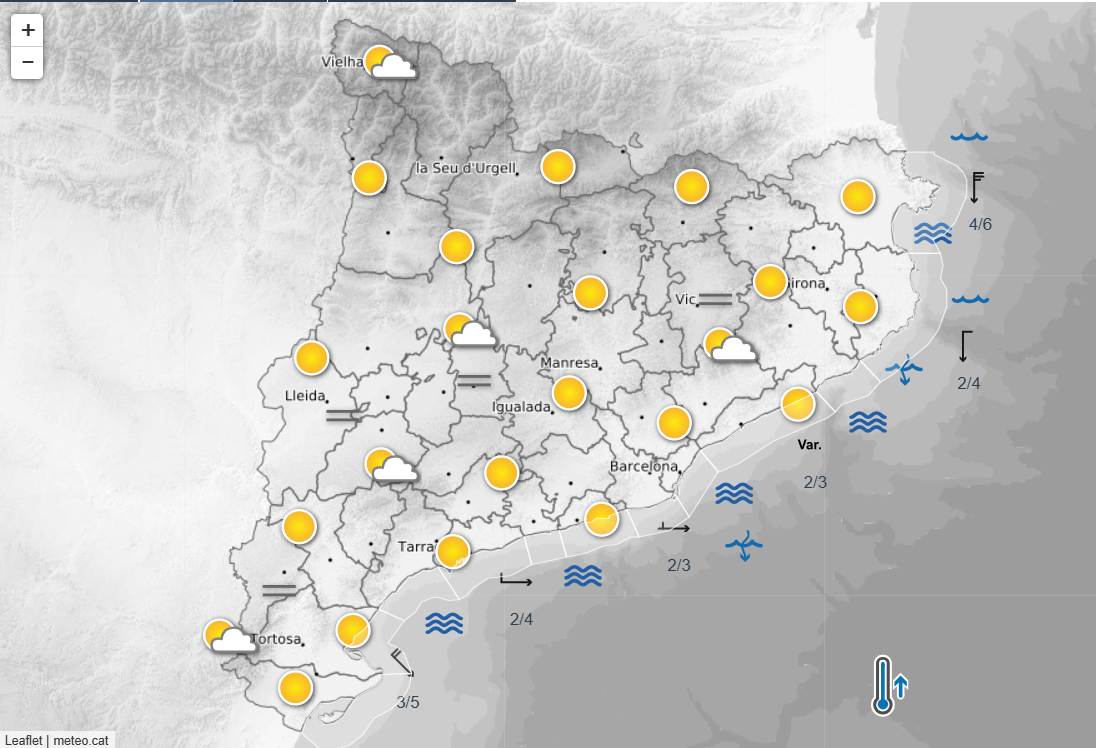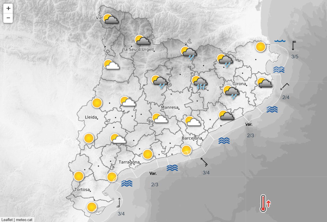 Durante la mañana el gran dominador será el sol, pero por la tarde el astro perderá protagonismo. En la mitad norte del país crecerá la nubosidad y el cielo quedará muy nublado. El aumento de estos bancos de nubes a partir de las horas centrales del día se traducirá en chubascos dispersos en varios puntos del territorio como el Pirineo, Prepirineo e interior del cuadrante noreste, una sorpresa en forma de precipitaciones en un día, hasta el momento, dominado por el sol. Al anochecer las nubes se mantendrán y se prevé que se pueda producir algún chubasco débil y aislado en puntos del sector central del litoral. El Meteocat señala que las precipitaciones en Cataluña serán «de intensidad débil, o localmente moderada, y acumularán cantidades mínimas de precipitación».