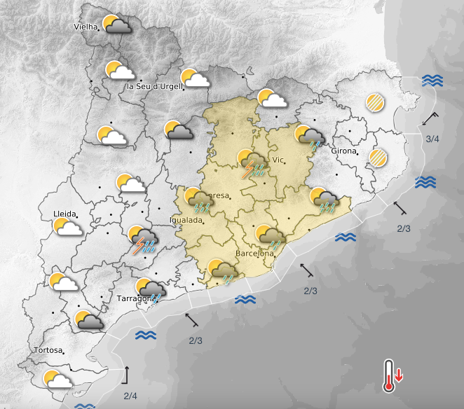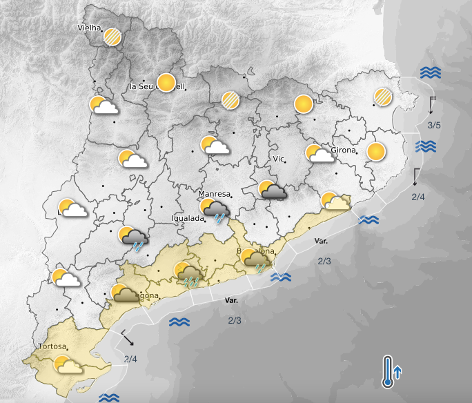La lluvia barrerá el litoral sur y central y posteriormente se trasladará a la Cataluña central. Durante la madrugada, las comarcas de Montsià, Baix Ebre, Baix Camp y Tarragonès estarán en alerta amarilla (peligro moderado) por lluvia intensa. A lo largo de la mañana las precipitaciones abandonarán las Tierras del Ebro y se moverán hacia el litoral de Tarragona y Barcelona, en concreto a las comarcas de Alt Camp, Tarragonès, Baix Penedès, Alt Penedès, Garraf, Baix Llobregat, Barcelonès y Maresme.