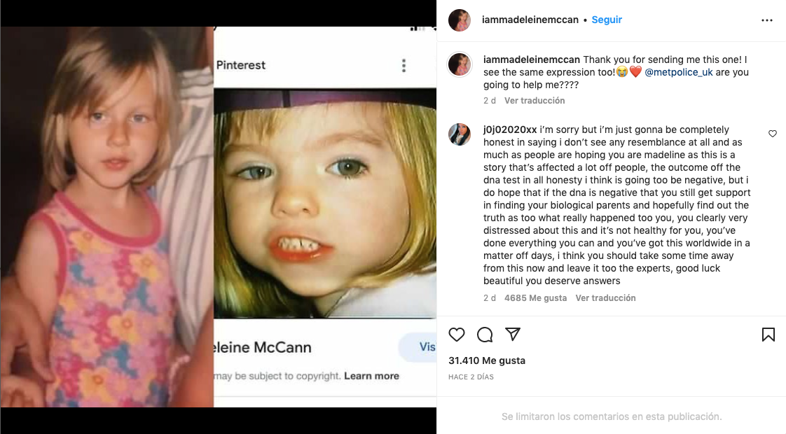 La primera publicación en Instagram es de hace seis días y, actualmente, ya acumula más de 780.000 seguidores (y no paran de subir). Es en la segunda publicación, en que comparte una foto suya de pequeña, en la cual detalla el primer motivo que la hace pensar que ella es Madeleine McCann: no tiene recuerdos de su infancia. Eso sí, dice que su memoria almacena el recuerdo de unas vacaciones en un lugar cálido, donde había playa y edificios blancos o de colores claros. La joven polaca explica que su familia, con quien vive en Alemania, se niega a darle más detalles de su pasado o que le dan información confusa. Su teoría coge fuerza cuando sus padres no quieren darle su certificado de nacimiento. A partir de este momento y de verse similitudes físicas con la pequeña Madeleine, empieza su investigación. Lo más importante por ella, según afirma en sus perfiles, es poder hablar con los padres McCann y someterse a las pruebas de ADN.