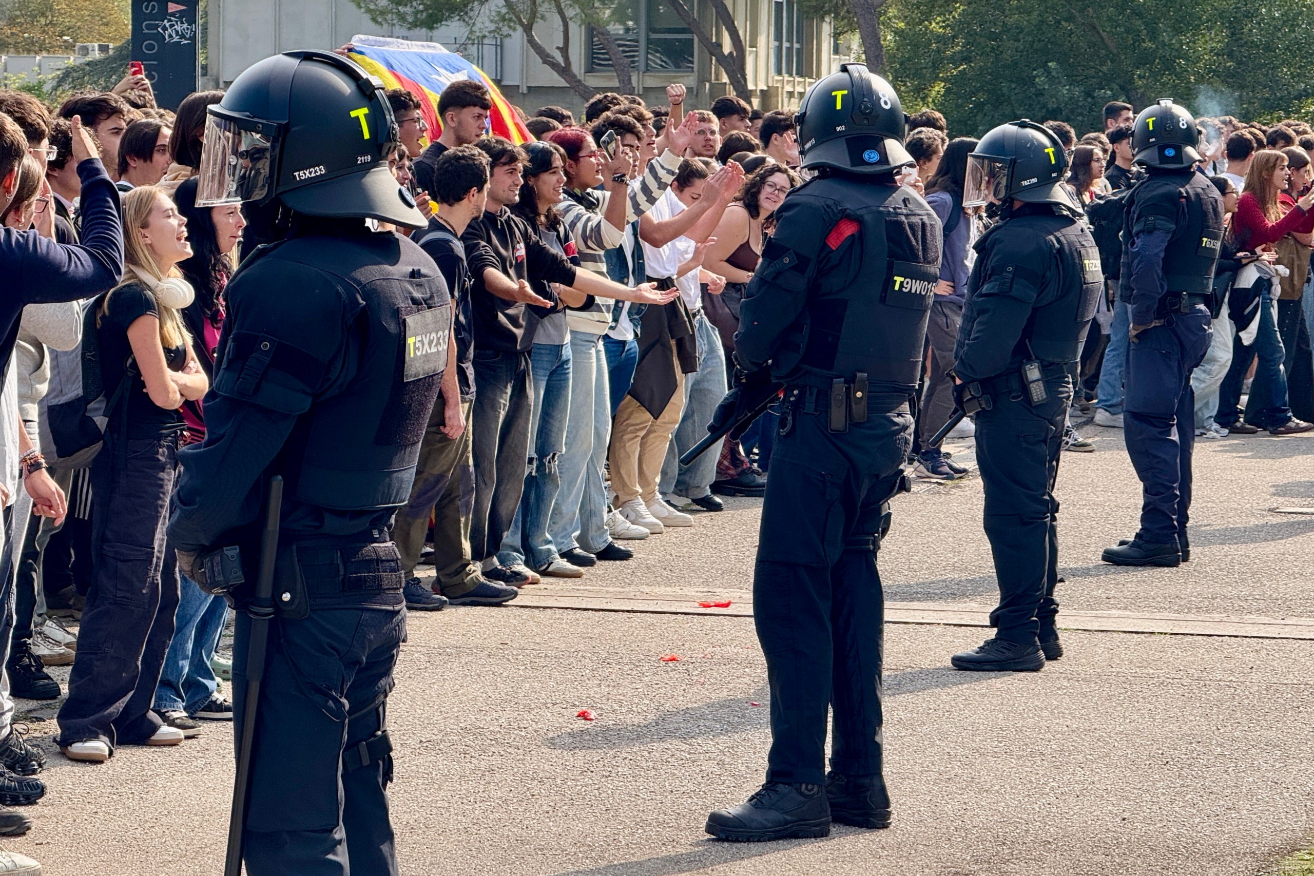 Ante los enfrentamientos entre los dos grupos, los Mossos decidieron actuar y cargaron contra los manifestantes antifascistas para separarlos del grupo de simpatizantes de Quiles, entre los que había miembros de la asociación ultraespañolista S’ha Acabat. Entonces comenzaron las carreras, el lanzamiento de objetos contra la línea policial y los golpes de porra. Los estudiantes, empujados por los Mossos, optaron por desplazar la protesta a la zona entre la biblioteca de Comunicación y la facultad de Periodismo, una zona mucho más estrecha.