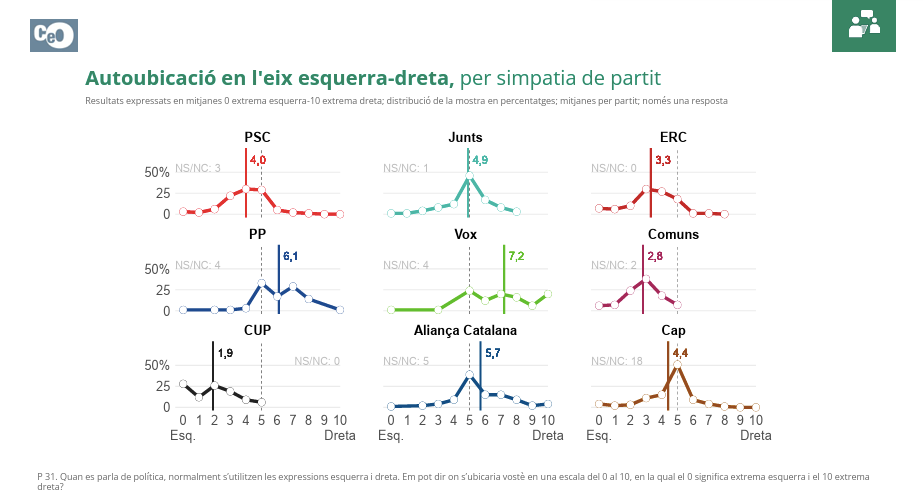 La autoubicación en el eje izquierda-derecha es una de las grandes diferencias entre los votantes de Aliança Catalana y los de Vox. Así, los primeros se perciben como parte de una formación de centro o centroderecha moderada (5,7), mientras que los de Santiago Abascal están claramente escorados a la derecha y tienen un porcentaje significativo de votantes que se considera extrema derecha sin reparos.
