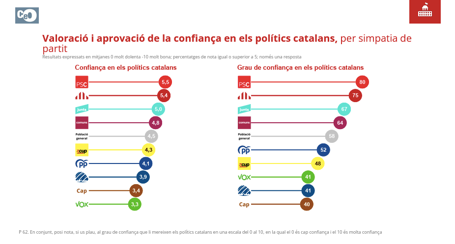 En la misma línea, la confianza en los políticos también está bajo mínimos entre los votantes de extrema derecha. Solo el 41% los aprueba. Los votantes de Vox ponen una nota media de 3,3 y los de Aliança un 3,9.