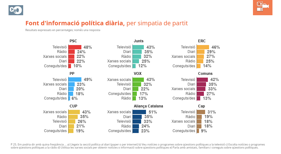 Otro punto en común entre Aliança Catalana y Vox es que sus votantes se informan de política sobre todo a través de las redes sociales, mientras que los del resto de partidos, excepto la CUP, lo hace a través de la televisión en primera instancia o a través de la radio o los diarios como segunda opción.
