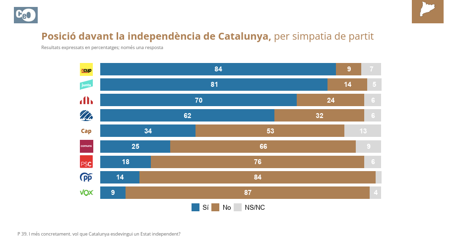 En el caso de la pregunta directa sobre la independencia de Cataluña, los votantes de Aliança Catalana también son los menos independentistas entre los independentistas. Solo el 62% dice apostar por la independencia del país, lejos del 70% de los votantes de ERC, el 81% de los de Junts y el 84% de los de la CUP. En cambio, en Vox son los más unionistas con un 87% de contrarios a la independencia, por encima del PP (84%) y del PSC (76%).