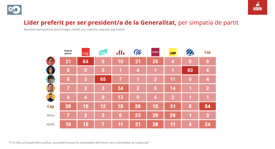 Los votantes de Aliança Catalana son los que tienen más claro quién es el líder preferido para ser presidente de la Generalitat. Un 80% considera que Sílvia Orriols es la persona idónea. Por comparación, solo el 64% de los votantes del PSC ven a Illa como el mejor presidente posible y un 65% de los de Junts elegirían a Carles Puigdemont para liderar el país. Más difícil lo tiene Oriol Junqueras, que solo recibe el 34% de los votos entre los suyos.