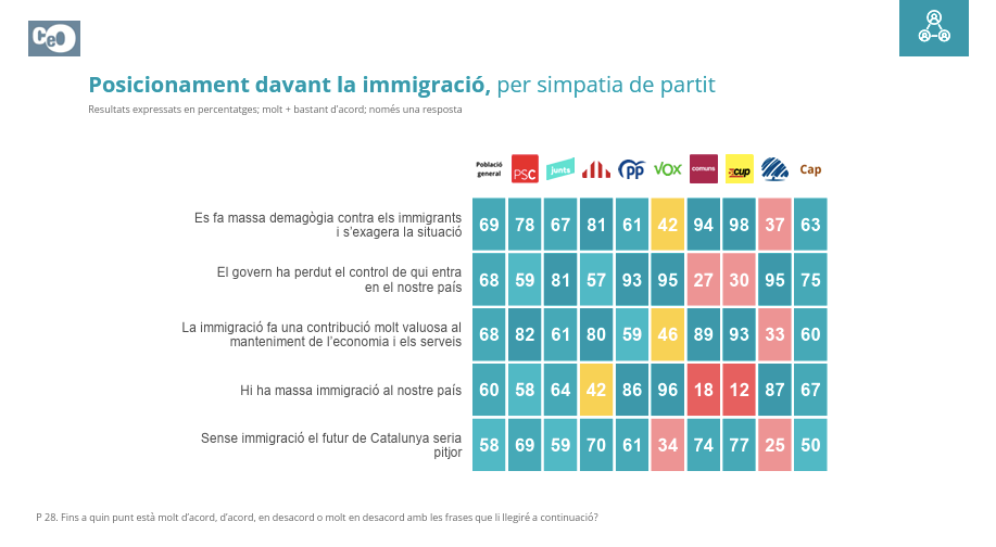 Los votantes de Aliança Catalana son los que tienen un discurso más radical con la inmigración, a menudo incluso más que los de Vox. La gran mayoría considera que no se hace demagogia contra los inmigrantes, piensa que el gobierno ha perdido el control de las fronteras o que hay demasiada inmigración.