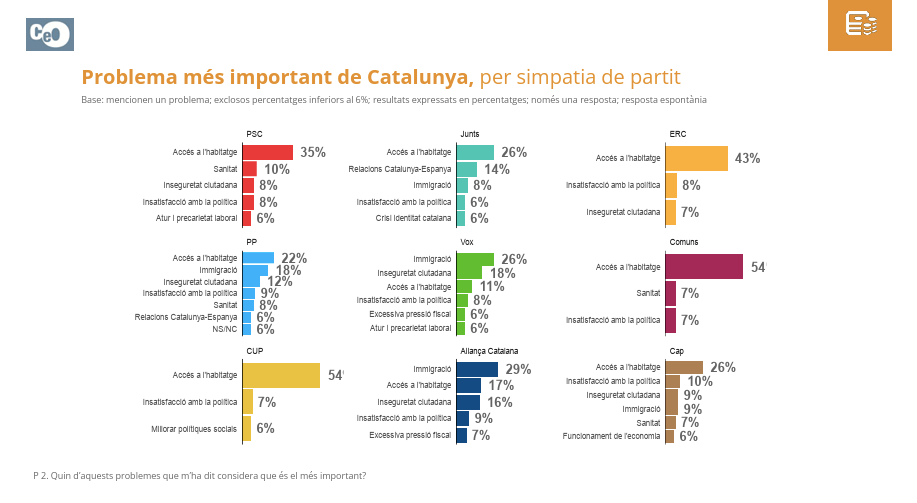 El apartado de los principales problemas de la ciudadanía permite ver cómo, lejos de las luchas nacionales, la extrema derecha construye un imaginario compartido. La inmigración solo es el «problema más importante de Cataluña» para los votantes de Aliança Catalana (29%) y de Vox (26%). Ni siquiera los del PP (18%) lo ponen en primera posición. El resto, con la CUP, los Comunes y ERC a la cabeza, tienen el acceso a la vivienda como principal preocupación. De hecho, los votantes de ningún partido excepto la extrema derecha y el PP mencionan la inmigración como problema en ninguna de sus respuestas.