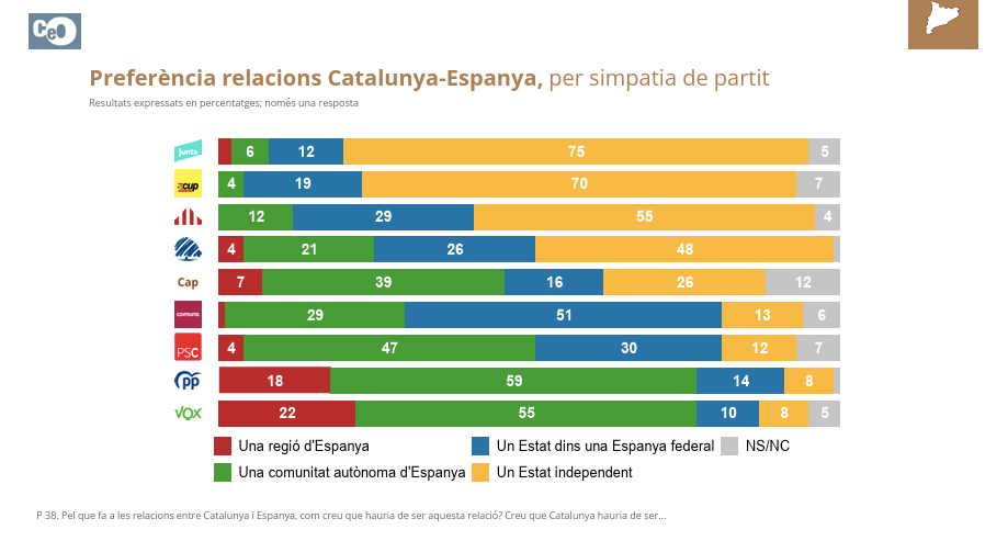 Las relaciones entre Cataluña y España también marcan cierta distancia entre las dos formaciones, ya que en Vox predomina claramente la preferencia porque Cataluña sea una región (22%) o una comunidad autónoma (55%) dentro de España, mientras que los votantes de Aliança Catalana optan por el Estado independiente (48%) como primera respuesta, el porcentaje más bajo entre todos los partidos independentistas. Sorprende que haya muchos votantes potenciales de Sílvia Orriols que opten por comunidad autónoma (21%) o un estado federal (26%) como solución al conflicto político.