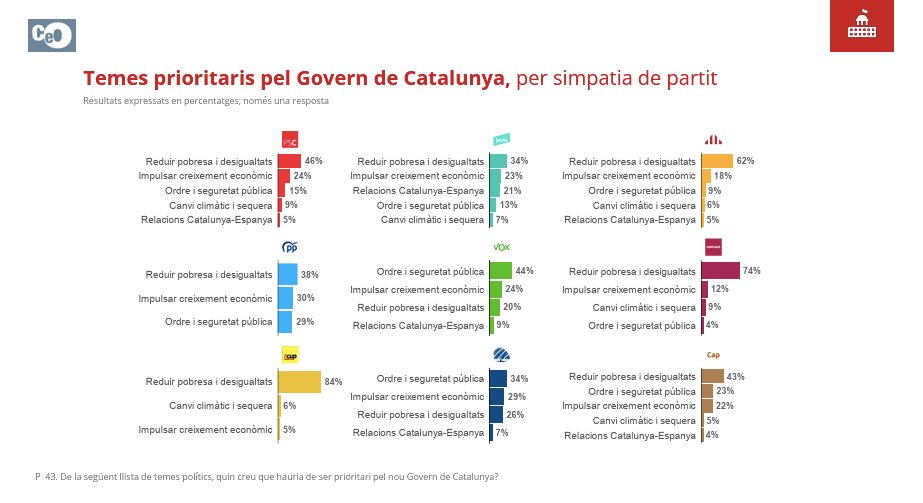 Igual que pasa con los principales problemas de la ciudadanía, los votantes de Aliança Catalana y Vox tienen una agenda muy similar a la hora de decidir qué temas deberían ser prioritarios para el Gobierno. El primero es el orden y la seguridad. Los del resto de partidos, incluido el PP, señalan la reducción de la pobreza como primera opción, mientras que la inseguridad baja hasta la tercera o la cuarta.