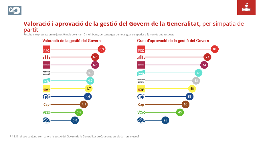 Otro punto en común de la extrema derecha es la desconfianza en las instituciones. Los votantes de Aliança Catalana y Vox son, con diferencia, los que ponen peor nota al Gobierno de Salvador Illa. Los de Aliança Catalana le ponen un 3, mientras que los de Vox le dan un 3,5. En cuanto al grado de aprobación, solo el 25% de los votantes de Sílvia Orriols aprueban la gestión del Gobierno Illa por el 43% de los de Santiago Abascal.