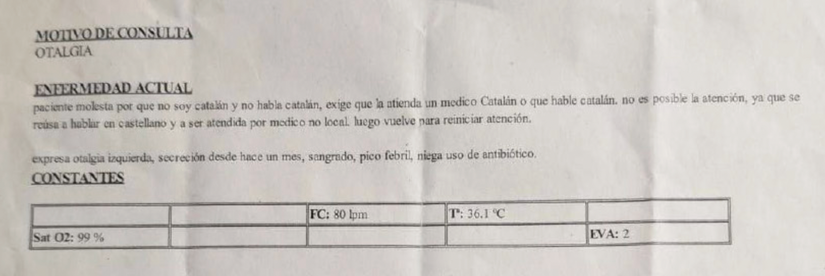 «Paciente molesta porque no soy catalán»