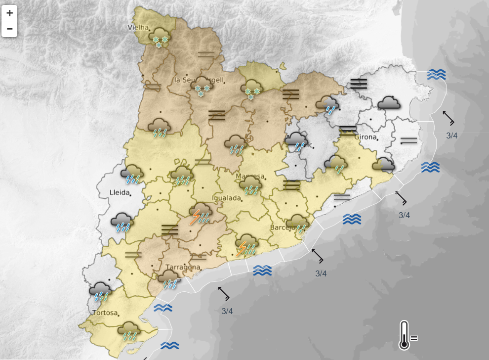 Un temporal de lluvia que ha hecho que el Servicio Meteorológico de Cataluña (SMC) aumente la probabilidad de que la acumulación de lluvia llegue a superar el umbral de los 100 litros en 24 horas en varias comarcas, sobre todo en las de montaña en el Pirineo y Prepirineo; aunque también se esperan fuertes precipitaciones en las comarcas tarraconenses y en el litoral catalán. La intensidad de lluvia es otro aspecto que preocupa al Meteocat y hay avisos moderados y altos por intensidad de lluvia en casi toda la mitad sur del país y se espera que durante el día las precipitaciones se desplacen hacia el litoral y prelitoral central y el norte. Desde Protección Civil de la Generalitat se ha activado en alerta los planes Inuncat y Neucat y se pide prudencia, especialmente en los desplazamientos.