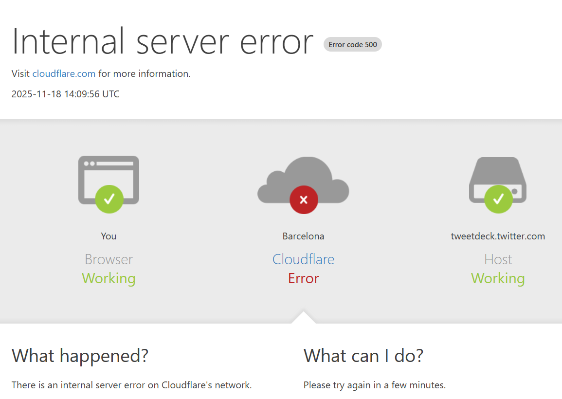 Cloudflare, la multinacional estadounidense dedicada a la distribución de contenidos, servicios de seguridad en internet y servicios de DNS está experimentando un error en su red global que ha provocado el apagón mundial de varios de sus clientes. Apps y videojuegos de renombre y con una gran carga de usuarios como la red social X (conocida anteriormente como Twitter), el ChatGPT y el videojuego League of Legends están sin servicio desde minutos antes de la una del mediodía.