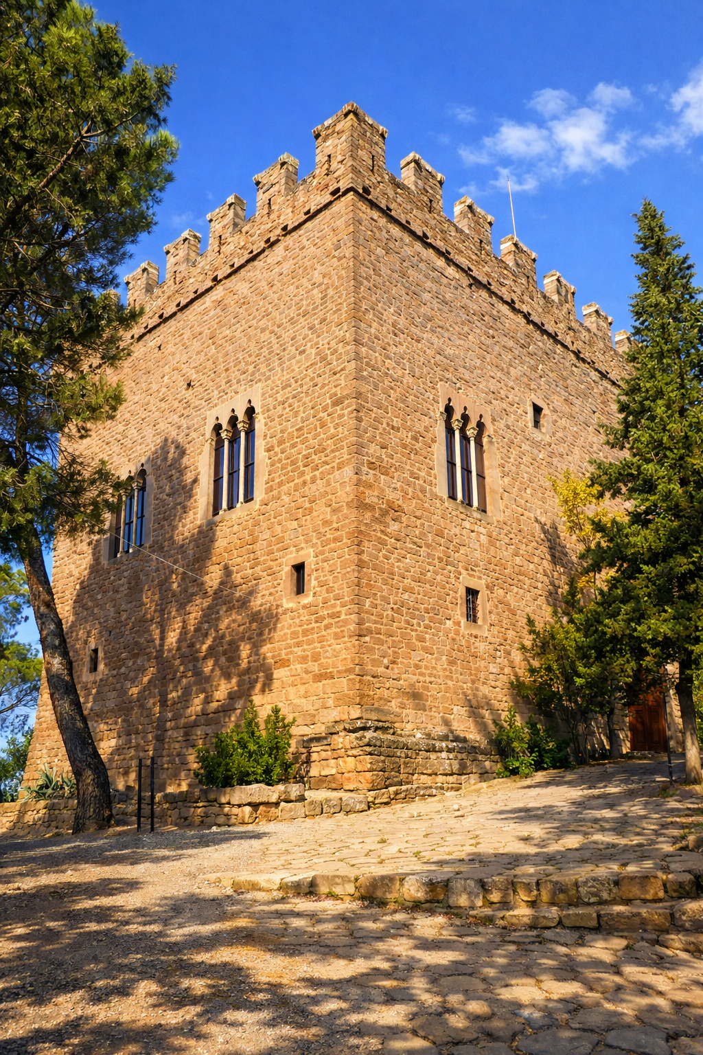 Aquest perfil de “palau fortificat” és part de la seva força visual. A diferència d’altres fortaleses que han quedat reduïdes a runes, aquí s’entén l’arquitectura d’una sola mirada: el perímetre, les línies rectes, l’alçada mesurada per resistir i, sobretot, el remat emmerletat que reforça la imatge de poder.