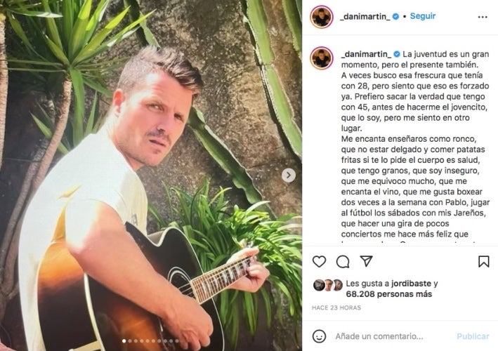 Dani Martín ha fet un exercici de transparència en el seu perfil d’Instagram, el que ha convertit en el millor espai per compartir les seves reflexions. Els fans l’han pogut conèixer molt més a fons des que ha fet aquest canvi, un pas endavant per deixar enrere la vergonya i començar a revelar què sent i què li passa. L’exitós cantant, conegut per ser el líder d’El Canto del Loco, vol deixar clar que la vida dels famosos no és tan meravellosa com pot arribar a semblar. En l’últim post que ha compartit, de fet, es descriu a si mateix d’una manera molt honesta: “A vegades busco la frescor que tenia amb 28 anys, però sento que ja és forçat. Prefereixo treure la veritat que tinc amb 45 abans de fer-me el jove. M’encanta ensenyar-vos que ronco, que no estar prim i menjar patates fregides si el cos t’ho demana és salut, que tinc grans, que sóc insegur, que m’equivoco molt, que m’encanta el vi, que m’agradar fer boxa dos cops per setmana, jugar a futbol els dissabtes i que fer una gira de pocs concerts em fa més feliç que fer-ne una amb molts”.