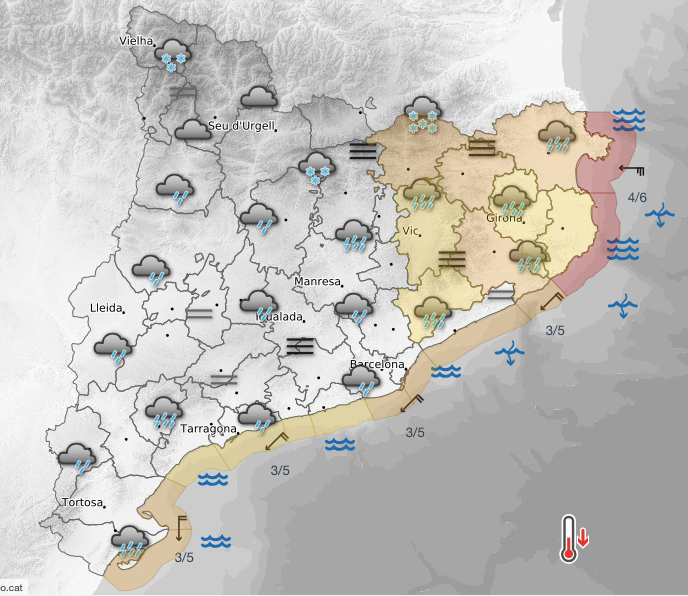 El Meteocat preveu que el cel estigui molt ennuvolat o cobert durant tot el dia arreu del país, tot i que pot haver-hi algunes clarianes transitòries durant el matí al Pirineu i Prepirineu de Lleida. Durant la matinada s’han produït els primers ruixats a les comarques de Girona i amb el pas de les hores la pluja s’escamparà per la resta del país. Amb tot, les precipitacions més abundants seran al nord-est, on es poden acumular 50 litres per metre quadrat i en alguns punts pot arribar fins als 100 litres. A la resta del país no s’esperen ruixats tan intensos. La cota de neu rondarà els 1.400 metres.