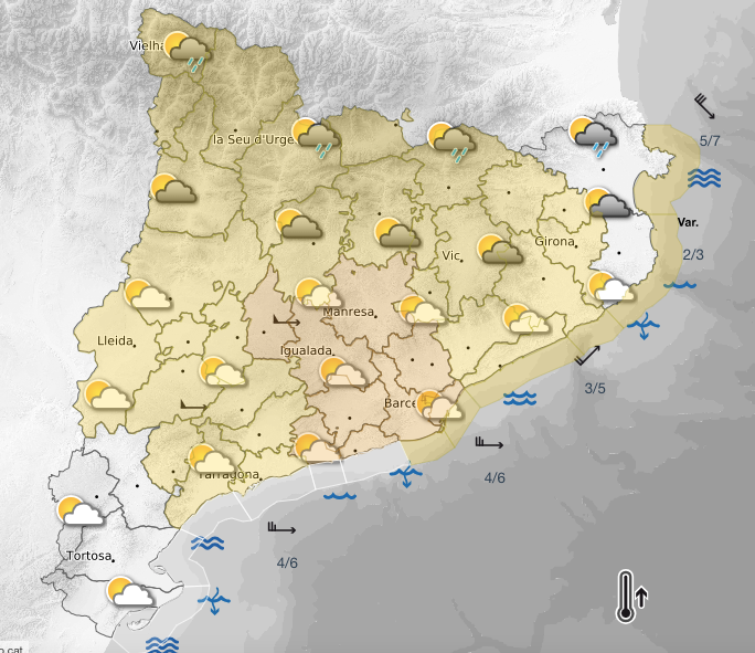 Les ventades han començat de matinada a la Plana de Vic i a l’interior de les comarques de Girona i partir del matí s’escamparan per pràcticament tot el territori. Seran especialment fortes al litoral barceloní, a l’interior de l’àrea metropolitana i a l’altiplà. El Meteocat ha activat l’alerta taronja (perill alt) al Baix Penedès, l’Alt Penedès, el Garraf, el Baix Llobregat, el Barcelonès, el Vallès Occidental, el Bages, l’Anoia i la Segarra. La resta de comarques estan en alerta groga (perill moderat).