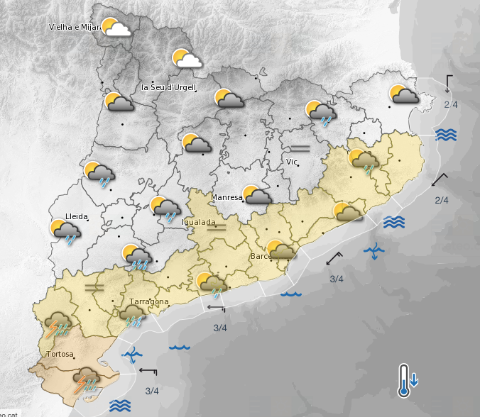El cel estarà molt ennuvolat durant tot el dia al litoral i el prelitoral. A la resta de Catalunya hi haurà nuvolades que minvaran al llarg del matí i deixaran pas a algunes clarianes transitòries. Durant el matí es preveuen pluges a tota la costa i al prelitoral, mentre que a l’interior seran poc probables i, si hi ha precipitacions, seran de forma aïllada. Les pluges es mantindran durant bona part del dia arreu del país i al vespre es restringiran a les Terres de l’Ebre, on hi ha possibilitat de tempestes fortes.