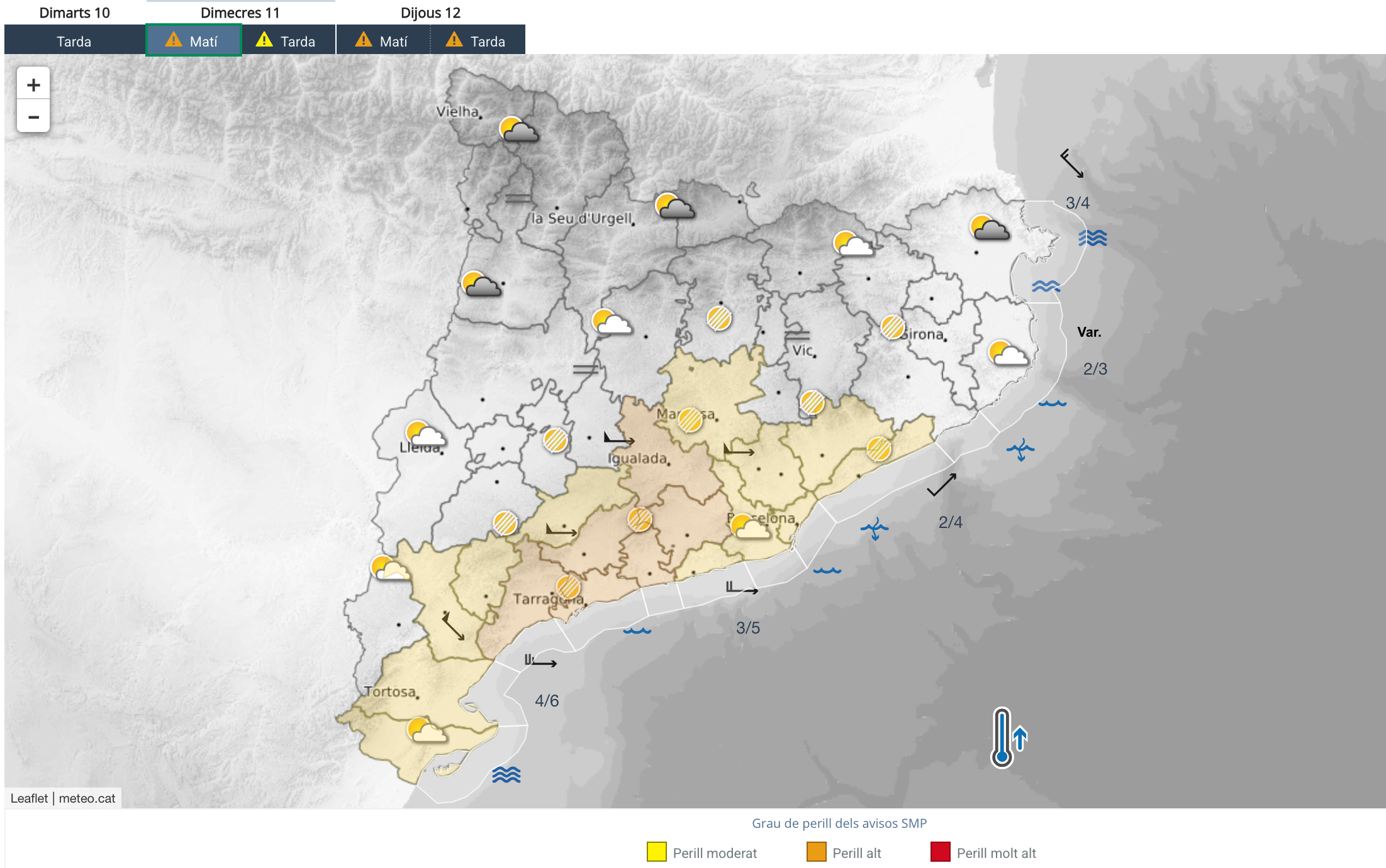 L’endemà dijous, les ventades s’estendran a tot el país, si bé s’espera que el perill es concentri a les comarques del Pirineu, a la zona del litoral i prelitoral central i a la franja central del territori. En aquestes zones, les ratxes també superaran els 70 km/h. Dijous es preveu també fort onatge, amb onades de 2,5 metres al litoral central i a la zona nord de la costa catalana.