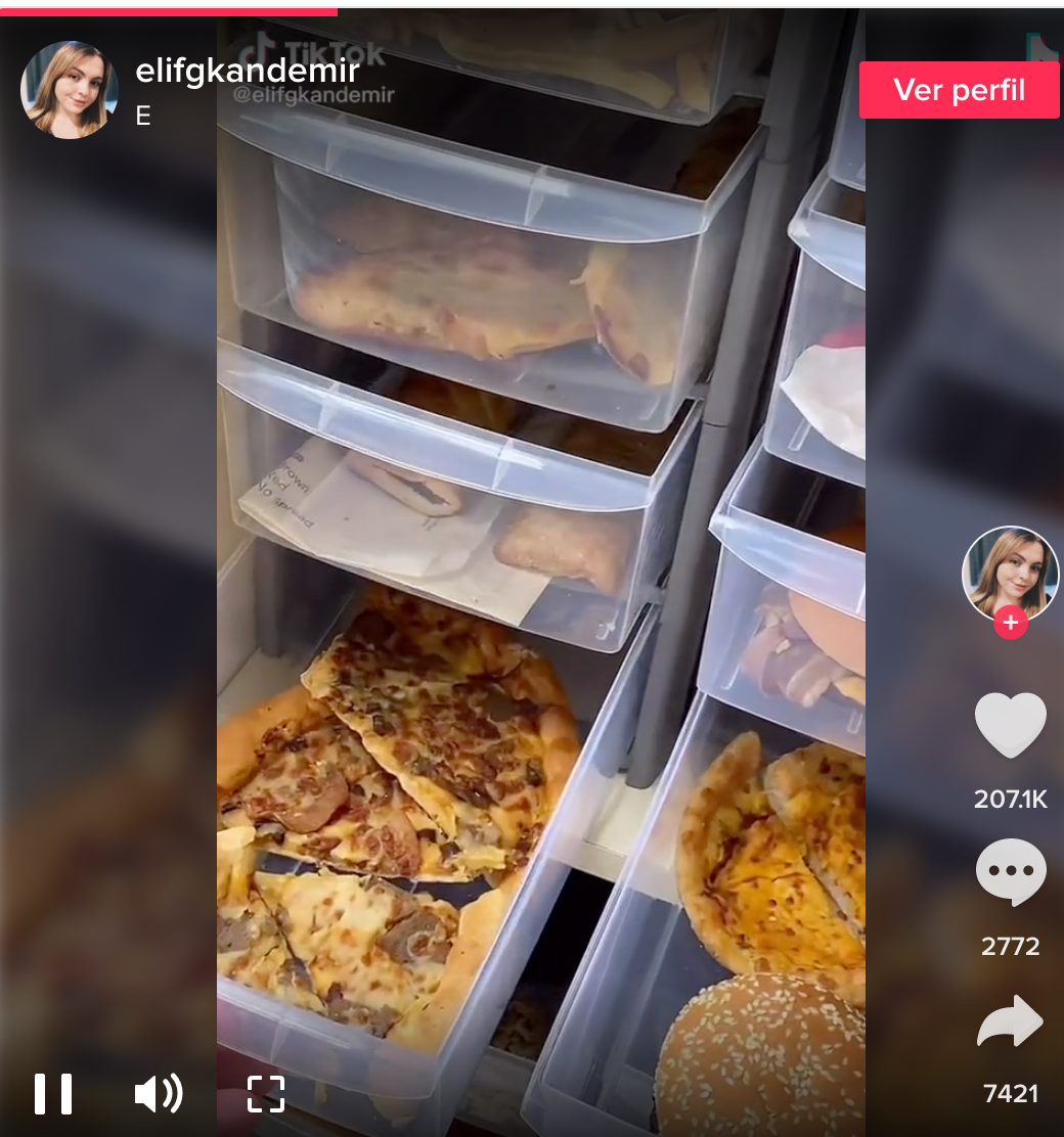 El vídeo de l’usuaria de Tik Tok @elifgkandemir s’ha viralitzat a les xarxes i ja s’ha vist més de tres milions de vegades. Què té d’especial? Es tracta d’un vídeo en què aquesta usuaria mostra l’estrafolari experiment de la seva mare: guardar durant anys menjar porqueria en un armari per demostrar que no es fa malbé. Al vídeo es pot veure un armari replet de nuggets, pastissos, dolços, pizza, donuts… que han de servir “per conscienciar sobre la obesitat”.