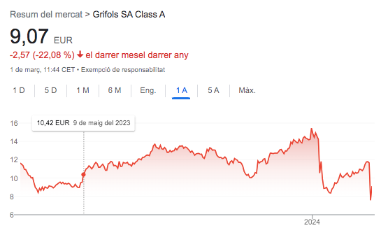 Esta semana había mucha expectación porque Grifols tenía que presentar sus primeros resultados después del demoledor informe y del nombramiento de Nacho Abia como nuevo consejero delegado. Era un punto de inflexión para la compañía, que optó para hacerlos públicos sin tener acabada la auditoría externa, encargada a KPMG. La primera jarra de agua fría para los inversores fueron los resultados anuales del 2023: una reducción del 71,5% de los beneficios, hasta los 59,3 millones, principalmente por una partida de 147 millones para afrontar los “costes de reestructuración”. Con todo, la farmacéutica comunicó unos ingresos récord de casi 6.600 millones de euros y un ebitda de 1.474 millones, por encima de las expectativas de los analistas. Pero lo que tenía que ser un movimiento tranquilizador para los inversores se convirtió en nueva pesadilla.
