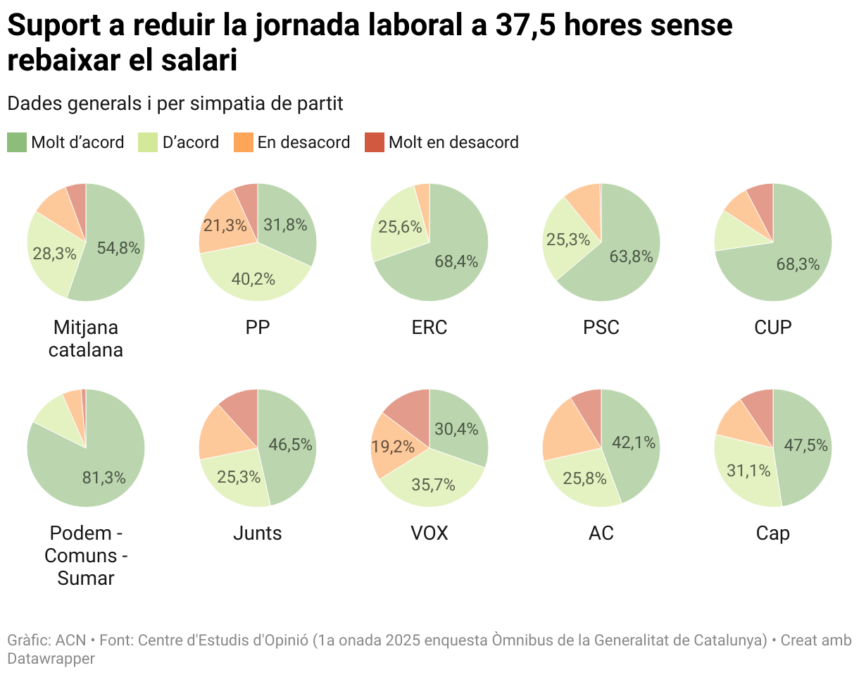 L’enquesta del CEO es va realitzar entre el 13 de febrer i el 14 d’abril, recollint dades de 1.797 persones. En aquests resultats es mostra que el suport a la reducció de jornada és molt transversal, ja que és vista com una mesura favorable entre tots els simpatitzants de tots els partits. Entre Junts, PP, Aliança Catalana i Vox, el suport es situa al voltant del 70%, mentre que la resta de partits -més a l’esquerra- hi donen un suport del 80% o més.
