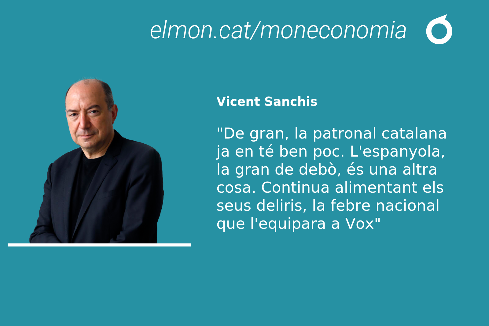 Res d’això té sentit ara. Esquerra i Junts -els dos partits parlamentaris independentistes majoritaris- han pactat amb el PSOE, i aquest pacte és el que dona “estabilitat” que ells exigeixen a la situació política. La “seguretat jurídica” continua sent l’habitual. En tot cas, els que s’han de sentir insegurs davant els jutges no són els empresaris, sinó els independentistes, als quals ningú garanteix la igualtat de tracte legal. La gran patronal catalana és una sucursal. Així els va. La pressió del centre econòmic i financer real s’ha deixat sentit en les darreres dècades i ha anat debilitant l’antiga hegemonia d’aquest país en quasi tots els sectors. De “gran”, la catalana ja en té ben poc. La patronal espanyola, la que mana, la gran de debò, és una altra cosa. Continua alimentant els seus deliris eterns, la febre nacional que l’equipara a Vox.