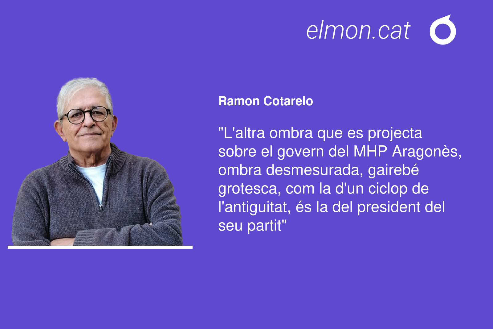 L’altra ombra que es projecta sobre el govern del MHP Aragonès, ombra desmesurada, gairebé grotesca, com la d’un ciclop de l’antiguitat, és la del president del seu partit, sublimat per un poetastre de la seva quadra com l’estel de la tramuntana. És el que tots els mitjans tenen com referència, a la vora del qual tota la resta es difumina, s’afebleix, s’endinsa en les ombres de la irrellevància. El que defineix la política del govern, per al govern i sense el govern, el líder carismàtic que, com Enric de York a la guerra de les dues roses, va sortir de la presó per asseure-se’n al tron; va sortir de l’ombra per ocupar tota la pantalla a tots els espais mediàtics, relegant el seu escolanet a les tenebres de les bambolines.