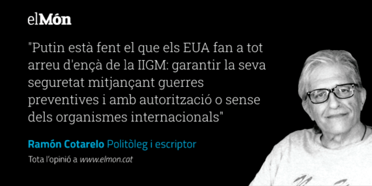 Per descomptat, cap equidistància, l’autor d’aquestes línies aniria sempre (si pogués) a viure als EUA en compte de fer-ho a Rússia. Però això no vol dir que hi hagi d’acceptar una política exterior que considera injusta, àdhuc criminal. Al cap i a la fi, Putin està fent el que els EUA fan a tot arreu d’ençà de la IIGM: garantir la seva seguretat mitjançant guerres preventives i amb autorització o sense dels organismes internacionals. Això no només és una arbitrarietat sinó que trenca amb la regla d’or de la moral universal: no facis als altres el que no vulguis que et facin a te. Però ho fan tots; els nostres, també.