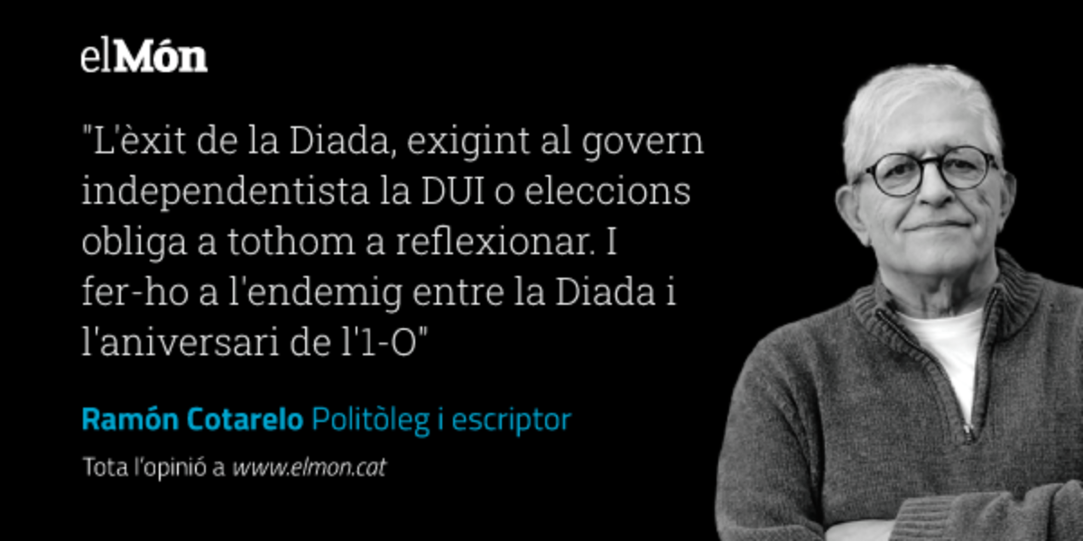 En qualsevol cas, l’èxit de la Diada, exigint al govern independentista la DUI o eleccions, com ha fet la presidenta Dolors Feliu, obliga a tothom a reflexionar. I fer-ho a l’endemig entre la Diada i l’aniversari de l’1-O. L’ANC es declara disposada a organitzar una llista cívica de país, per sobre dels partits polítics. Seria una quarta opció independentista i implicaria un perill de populisme, ens avisa, ominós, Jordi Sánchez, digne representant d’un dels partits del trípode que suporta la partitocràcia catalana, una classe política professional que ha dut el país al marasme.
