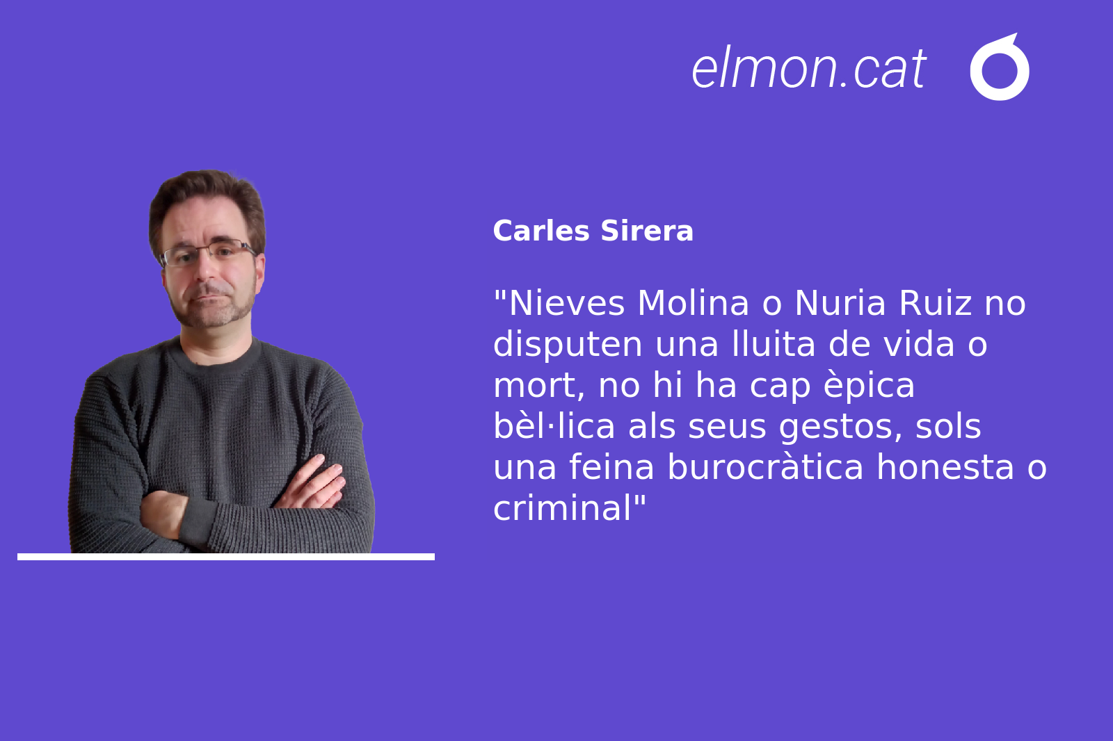 Mon pare i jo solíem discutir prou sobre el caràcter que hi ha darrere de funcionaris com Nieves Molina o Nuria Ruiz. És una temàtica d’alt potencial dramàtic, perquè les seves misèries, apaties i ambicions expliquen l’heroisme o la maldat de les nostres societats acomodades. No disputen una lluita de vida o mort, no hi ha cap èpica bèl·lica als seus gestos, sols una feina burocràtica honesta o criminal. Nieves Molina feu tot el possible per protegir el poder i menysprear a les víctimes i els ciutadans. Mai no he dubtat que s’imaginava al TSJCV com a recompensa per la seva tasca, però continua com a titular del mateix jutjat d’instrucció on es guanyà una infàmia eterna. Suposo que encara espera el seu premi, perquè sap que tard o d’hora tots l’oblidaran i podrà recollir els rèdits de la seva obra. Per això mateix, mon pare tingué el detall d’immortalitzar-la sobre els escenaris: per fer més difícil que l’oblidem.