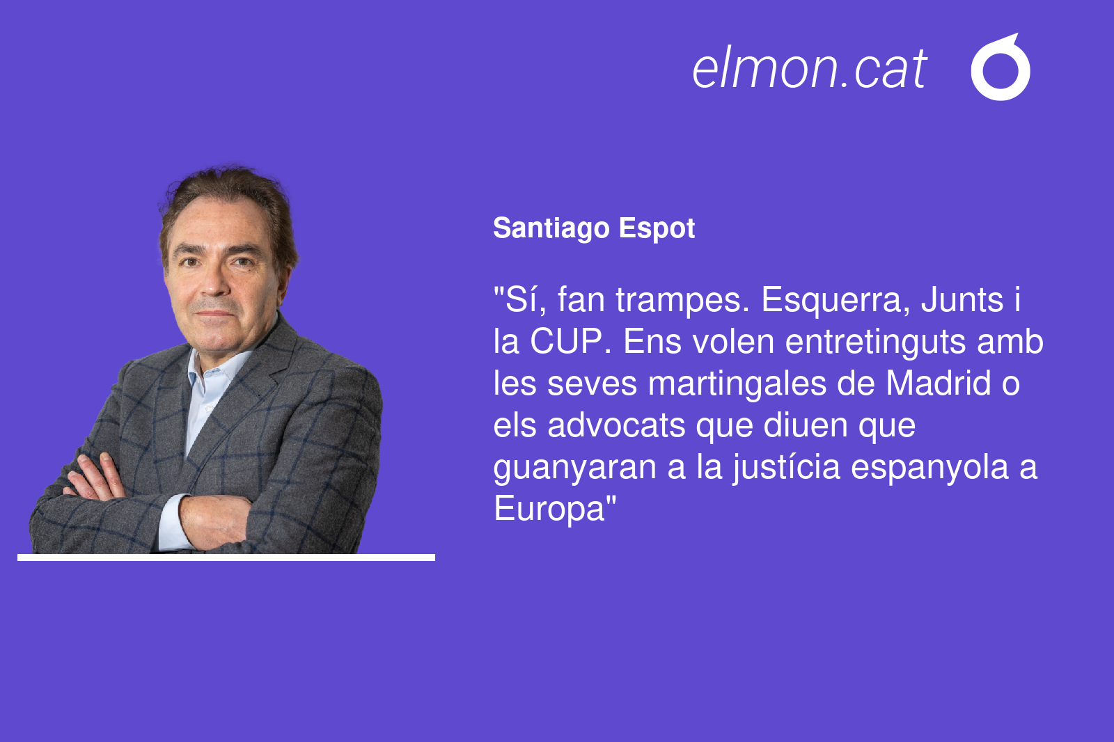 Sí, fan trampes. Tots. Els d’Esquerra, els de Junts i els de la CUP. Ens volen tenir entretinguts amb les seves martingales de Madrid o els advocats que diuen que guanyaran a la justícia espanyola a Europa. Ens acosta això al nostre objectiu? En absolut. Amb aquests plantejaments tot queda reduït a un problema intern espanyol sobre si hi ha més o menys democràcia dins els poders de l’estat.