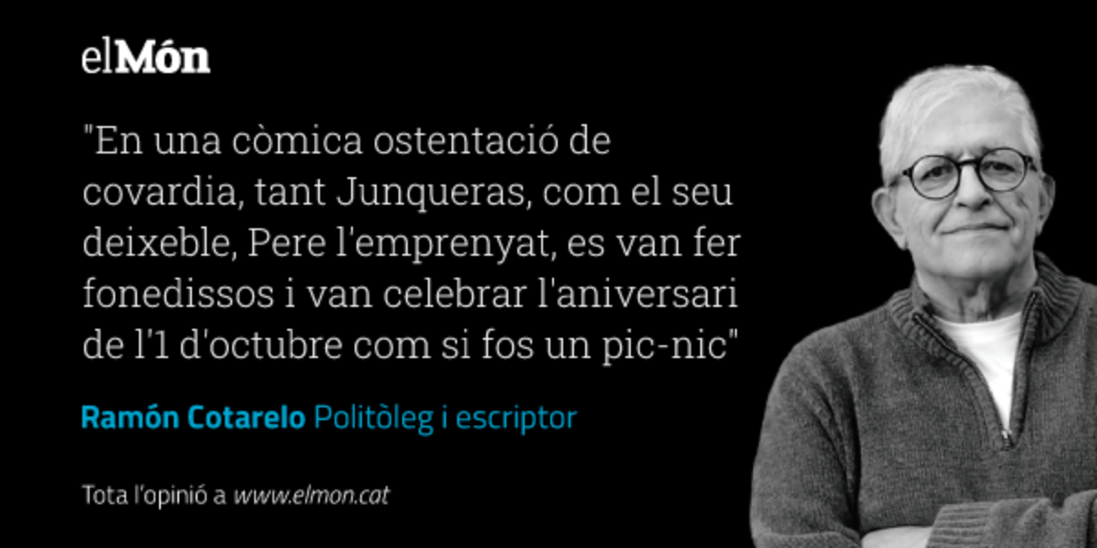En una còmica ostentació de covardia, tant Junqueras, com el seu deixeble, Pere l’emprenyat, es van fer fonedissos i van celebrar l’aniversari de l’1 d’octubre com si fos un pic-nic. Probablement, sota els efectes del bel menjar, Junqueras va reclamar per al seu partit el copy right gairebé exclusiu de l’1-O. Al mateix temps, tots dos van donar llur vistiplau a la idea de enviar una dona, ara en segona fila política, però amb un passat simbòlic, en l’esperança que la gent no l’escridés tant com faria amb ells.