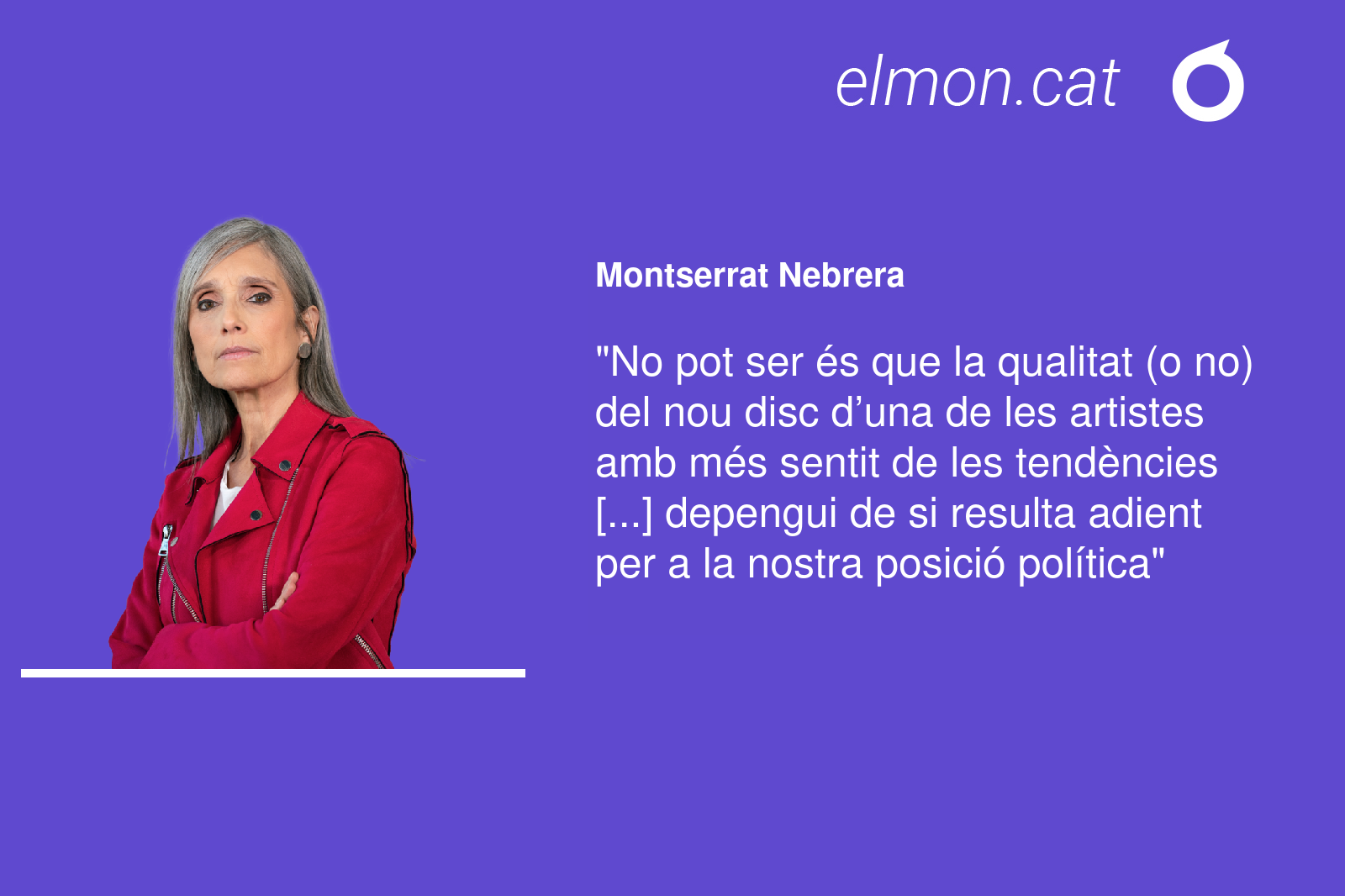 El que no pot ser és que la qualitat (o no) del nou disc d’una de les artistes amb més sentit de les tendències i els gustos dels consumidors de música i espectacle, que juga quasi des del principi amb un nivell de producció que altres, excepte Aitana, no tenen, i que sense dubte té un nivell de formació musical que la majoria sols somia, depengui de si ens resulta adient per a la nostra posició política. Qui s’ha d’apropiar de la Moreneta? L’indepe, el creient, el convers, el cumbaià?