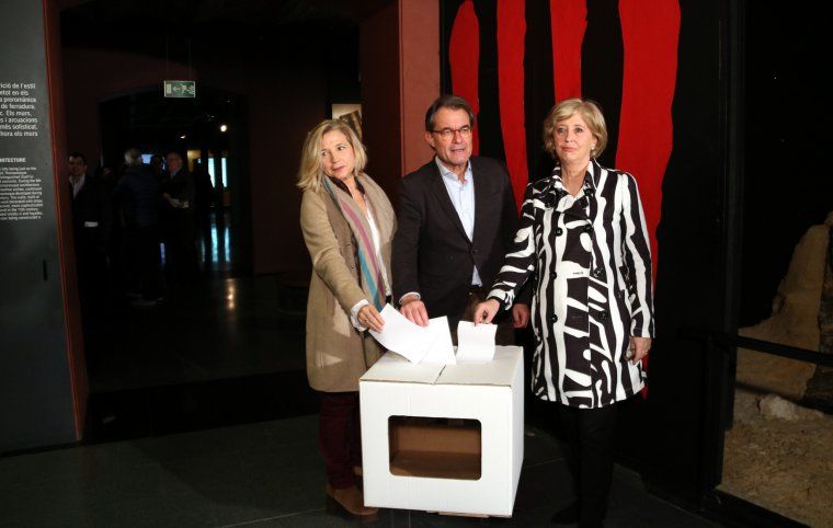 Mas, Ortega i Rigau, davant d’una urna com la del 9N