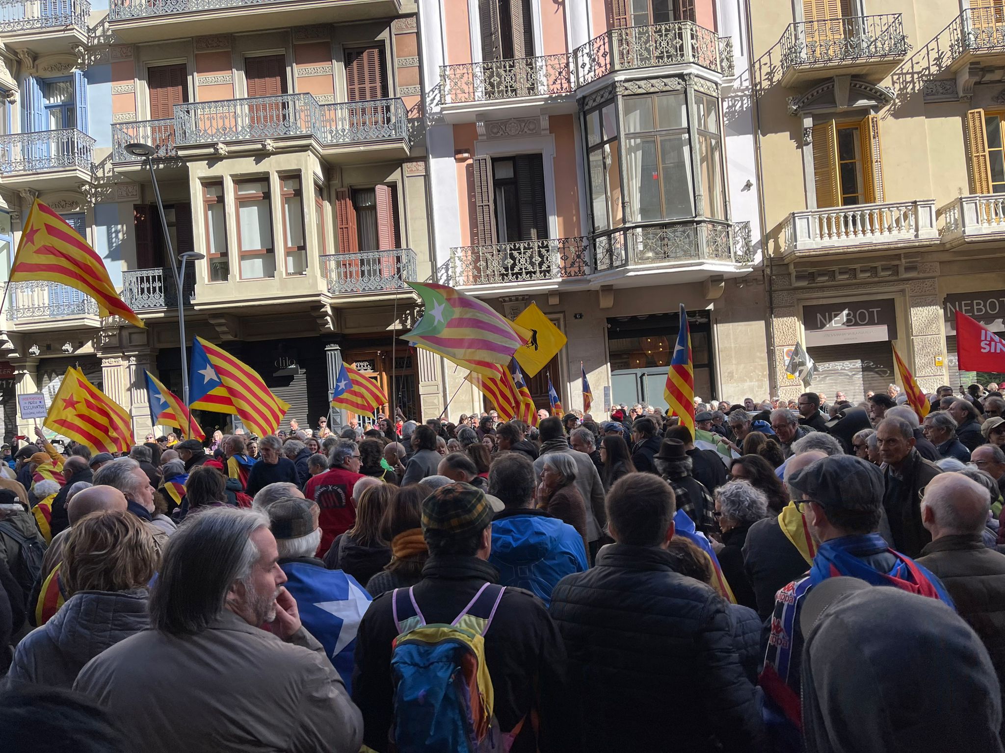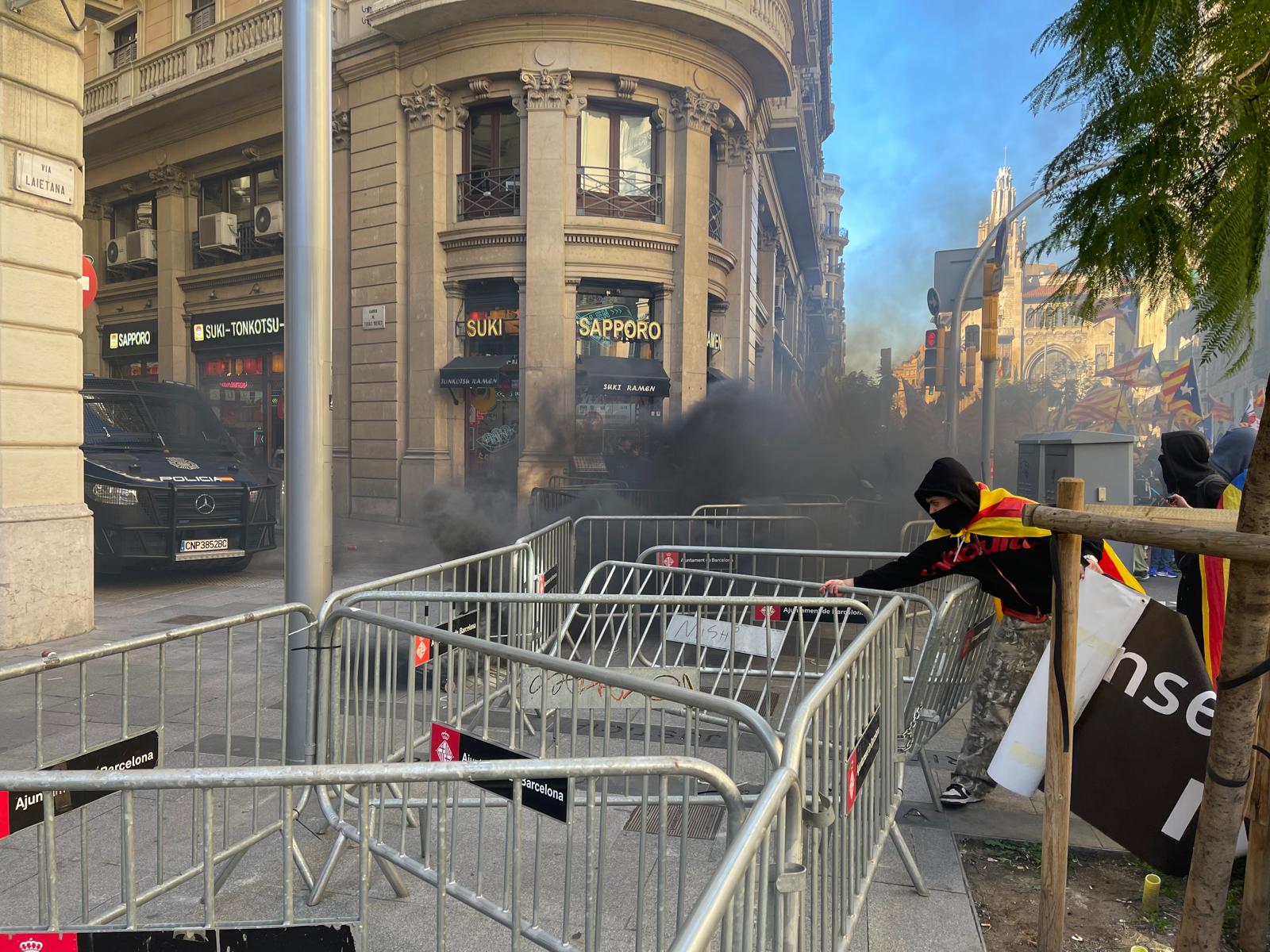 Quan la manifestació ha baixat per la Via Laietana i ha arribat a l’altura de la Prefectura Superior de la Policia Nacional, un grup d’una vintena de joves han llençat uns coets petits contra els agents que protegien l’edifici i s’han produït crits de “Puta Espanya”. A més, els manifestants han ensenyat el cul a la dotació policial que, amb dos escopeters, s’ha desplegat per protegir la zona, i han retirat les tanques que hi havia davant de la comissaria.