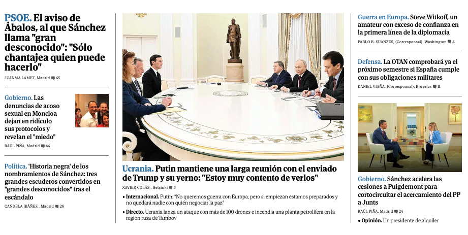 L’acostament de Pedro Sánchez a Junts per salvar la legislatura espanyola ha passat desapercebuda a la dreta mediàtica de Madrid, que prefereix collar el president espanyol per la resta de crisis que afecten el seu entorn. Dels grans diaris madrilenys, només El País recull el gest de Sánchez a la seva portada en paper. El Mundo prefereix centrar-se en les denúncies per assetjament sexual d’un dels homes de confiança del líder socialista; La Razón entrevista el president de Castella i Lleó, Alfonso Fernández Mañueco, i recull els malabarismes de la Moncloa pel cas d’assetjament; i l’ABC destaca els canvis que el Ministeri de l’Interior ha fet a la Unitat Central Operativa (UCO) de la Guàrdia Civil rellevant tres comandaments clau en les investigacions de corrupció de José Luis Ábalos i Santos Cerdán.