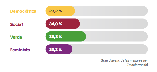 El Govern ha presentat un document amb les gairebé 1.500 accions que conté l’acord de legislatura entre ERC i Junts. En concret, es tracta de 1.486 ítems –782 mesures i 702 submesures– que es poden consultar a través d’una pàgina web específica. Dels quatre grans eixos que impulsa el Govern, la transformació social és la que té més mesures (365), seguida de la transformació social (212). El grau d’avenç global és del 33,88%.