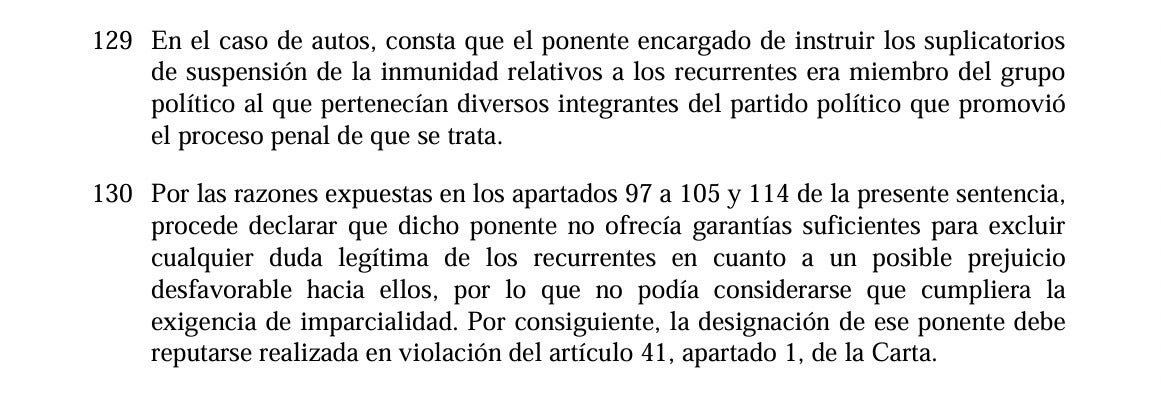Un dels punts forts del recurs era la manca d’imparcialitat d’Adrián Vázquez, eurodiputat de Ciutadans i president de la comissió Iuri, encarregada de tramitar els suplicatoris, i del ponent del suplicatori, eurodiputat búlgar del mateix grup de Vox. Vázquez ja ni milita en una formació clausurada políticament. Ara bé, el tribunal és contundent a l’hora de raonar la seva resolució amb una critica al ponent més que contundent. “És procedent declarar que aquest ponent no oferia prou garanties per excloure qualsevol dubte legítim dels recurrents quant a un possible prejudici desfavorable cap a ells, per la qual cosa no es podia considerar que complís l’exigència d’imparcialitat”, conclouen per donar la raó a l’exili.