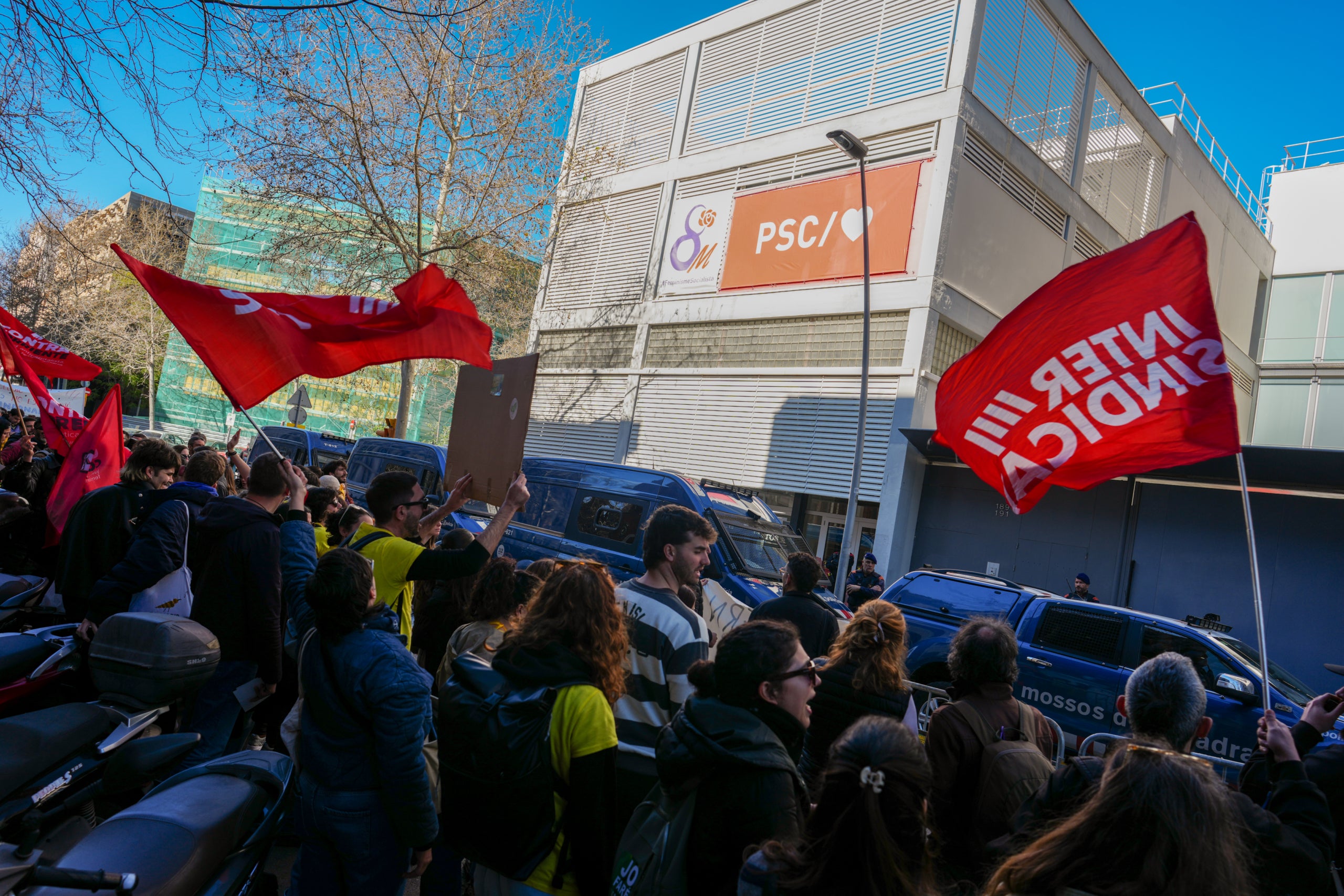 Hores més tard, alguns manifestants s’han acostat a la seu nacional del PSC al carrer de Pallars de Barcelona. Uns tres-cents docents, la majoria afiliats a la CGT i la Intersindical, havien quedat a la parada de metro de Llacuna (barri del Poblenou) i s’han desplaçat al centre d’operacions socialista, que estava acordonat pels Mossos. Els manifestants han lamentat que el Govern els doni el que consideren “engrunes” i l’ha exigit que inverteixi el 6% del PIB al sistema educatiu. Les protestes es traslladaran a la plaça d’Urquinaona de Barcelona, epicentre de la protesta del dilluns.