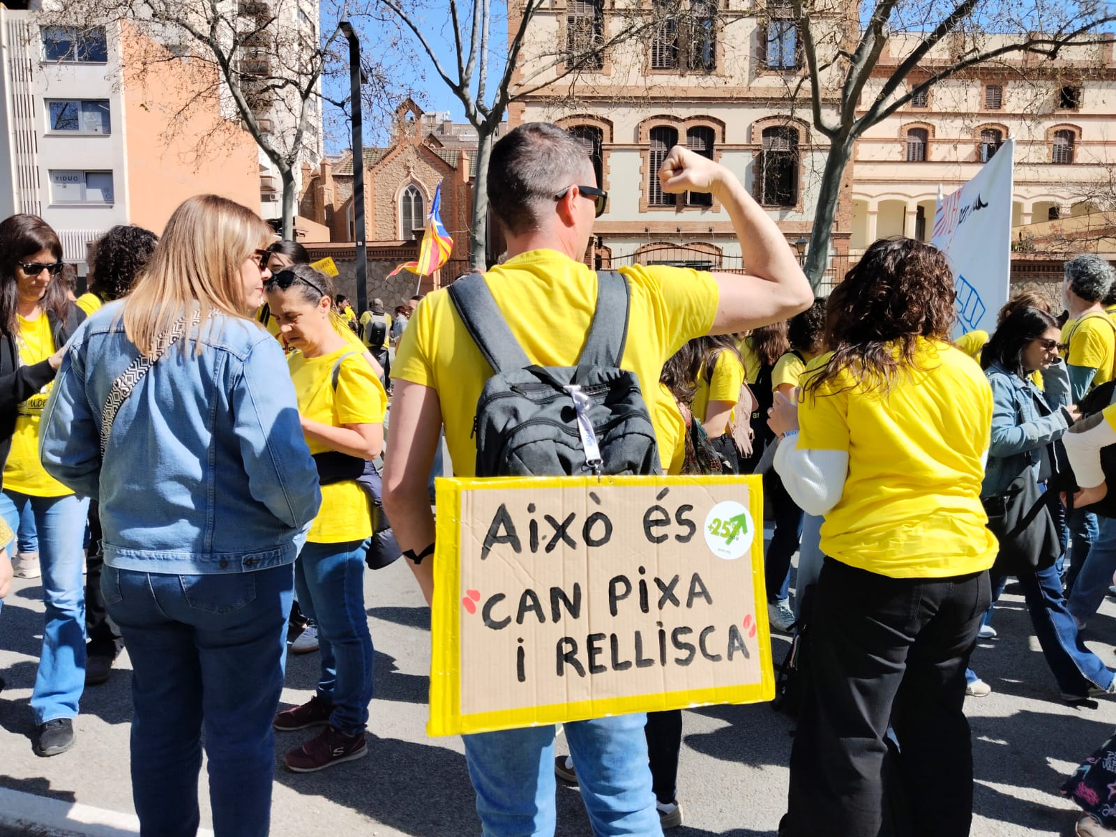 Els càntics, constants i cada dia més originals, s’han obert pas entre pancartes. Algunes, les més típiques, dibuixen un pàrquing de cotxes gegant. “Els problemes no s’aparquen, es gestionen”, retreuen alguns mestres. D’altres, més originals, fan ironia. “Volem més plantilla, no sigui ratilla”, apunta –dirigida al president– una de les més crítiques, que ha arribat a col·locar-se a primera línia del front en arribar al Parlament. També amb humor, en Ferran, que ha baixat de Girona, se’n fa eco d’un dels mems més virals de l’any. “Això és can pixa i rellisca”, va dir un maresmenc a TV3 durant la crisi de Rodalies. Es va fer viral i avui ha aparegut entre els docents. “És un lema que representa molt bé en quin punt està el país. Valia per a Rodalies, però avui també ens val a nosaltres o a altres serveis essencials”, explica en Ferran.