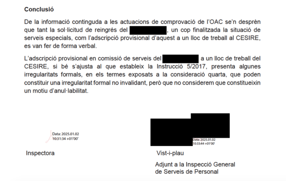 Paral·lelament a la conclusió d’Educació sobre l’activitat –o falta d’activitat– de Cambray al CESIRE, l’Oficina d’Antifrau ha conclòs que el nomenament de l’exconseller per al seu nou càrrec es va dur a terme “mitjançant una comissió de serveis” -mentre que normalment s’accedeix a aquesta plaça a través d’un concurs públic- i que es va fer “de forma verbal i sense la proposta prèvia de la direcció general corresponent que estableix la Resolució EDU/1443/2023”. “L’adscripció provisional en comissió de serveis a un lloc de treball del CESIRE, si bé s’ajusta al que estableix la Instrucció 5/2017, presenta algunes irregularitats formals”, conclou la investigació de l’Oficina d’Antifrau.