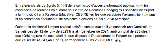 També com apunta el mateix departament, Cambray va cobrar 26.706,68 euros nets durant el seu pas de vuit mesos pel CESIRE: “Quant a la destinació i import salarial satisfet, consta que se li va concedir una Comissió de Serveis des del 12 de juny de 2023 fins al 4 de febrer de 2024, amb un total de 238 dies, i que l’únic registre del seu salari de què disposa el Departament és l’import total percebut, que va ser de 41.541,46 € bruts, corresponent a uns 26.706,68 € nets”, conclou la resolució de la SAIP firmada per Teresa Sambola. És a dir, en altres paraules, l’actual conselleria d’Educació determina que Cambray va cobrar més de 26.000 euros nets per dur a terme unes tasques en matèria d’investigació de les quals no en consta documentalment la seva participació, ni en els projectes ni en les reunions d’aquest organisme públic.