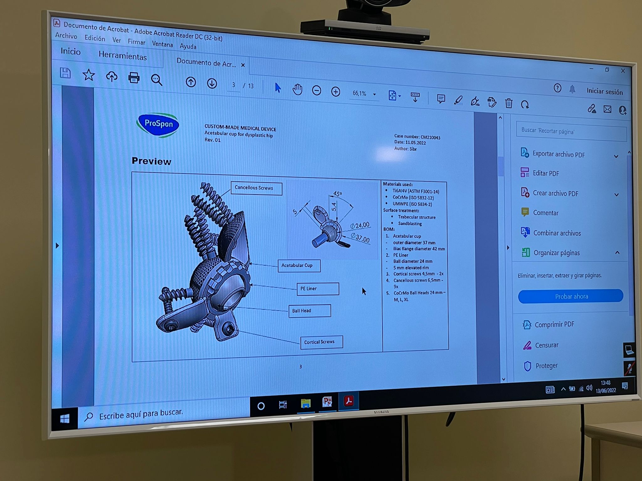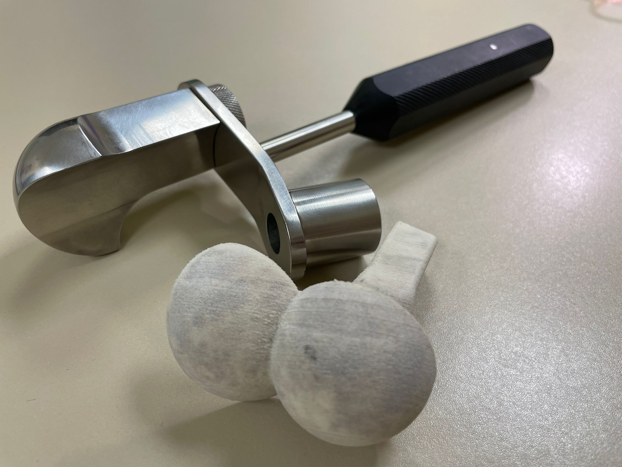 Moltes proves de radiodiagnòstic per la imatge, TAC i radiografies després, el doctor i els enginyers van aconseguir el disseny perfecte de la pròtesi feta a mida per a aquest pacient. Juntament amb aquest disseny a mida també es van fabricar l’instrumental i les guies per a l’implant i el model de prova sintètic per a la cirurgia. El doctor va optar per dissenyar aquest tipus de pròtesi perquè el pacient no s’adaptava a cap de les talles estàndard i les guies tampoc no s’ajustaven a les necessitats del pacient.