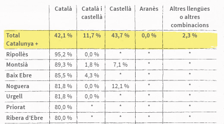 El català ja només és la llengua habitual d’un terç dels habitants de Catalunya, segons l’enquesta d’usos lingüístics que han presentat el Departament de Política Lingüística i Institut d’Estadística de Catalunya (Idescat). La situació d’emergència que viu el català es reparteix de manera desigual segons la zona, però les dades territorialitzades no es presentaran fins a l’estiu i no baixen al detall de cada comarca. Les últimes dades disponibles per comarques són del Baròmetre d’Opinió Política (BOP) del CEO del 2022, que mostra grans diferències entre comarques i estableix que el 42,1% dels parlants s’identifica només amb el català, és a dir, que, quan els van preguntar “quina és la teva llengua?”, van respondre que únicament sentien el català com a llengua pròpia.