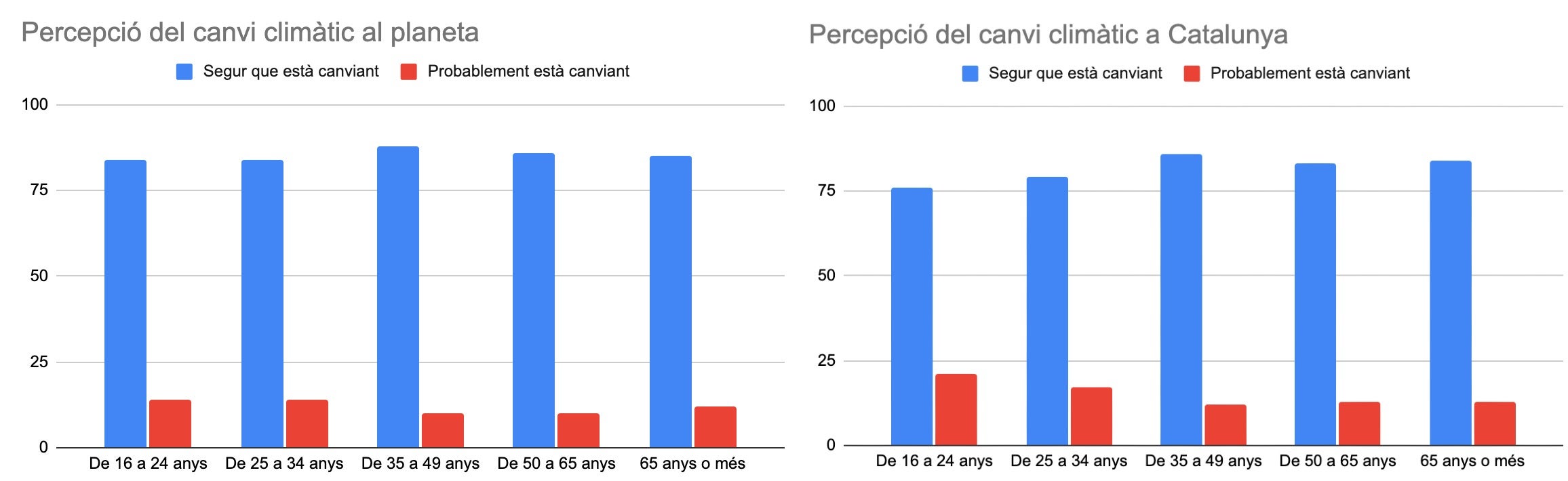 En la percepció sobre el canvi climàtic a Catalunya es reprodueix aquesta tendència: el 84% de la població femenina assenyala que “segur que està canviant” el clima a Catalunya, mentre que els homes que ho creuen són el 81%. Pel que fa als que responen que “probablement està canviant”, de nou la població masculina mostra més escepticisme, un 15%, dos punts més que en el cas de les dones (13%).