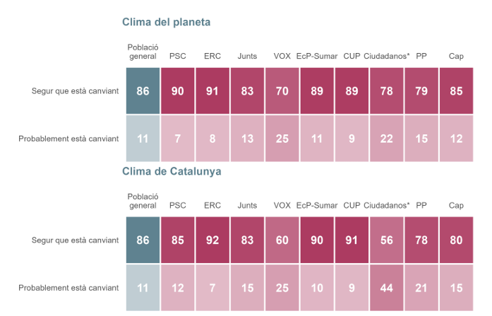 Els votants del que es podria anomenar com a bloc d’esquerres -Esquerra Republicana de Catalunya (ERC), En Comú Podem-Sumar i la Candidatura d’Unitat Popular (CUP)- veuen que el clima del planeta “segur que està canviant” en el 91%, 89% i 89% dels enquestats, mentre que l’escepticisme de “probablement està canviant” se situa en el 8%, 11% i 9% respectivament.