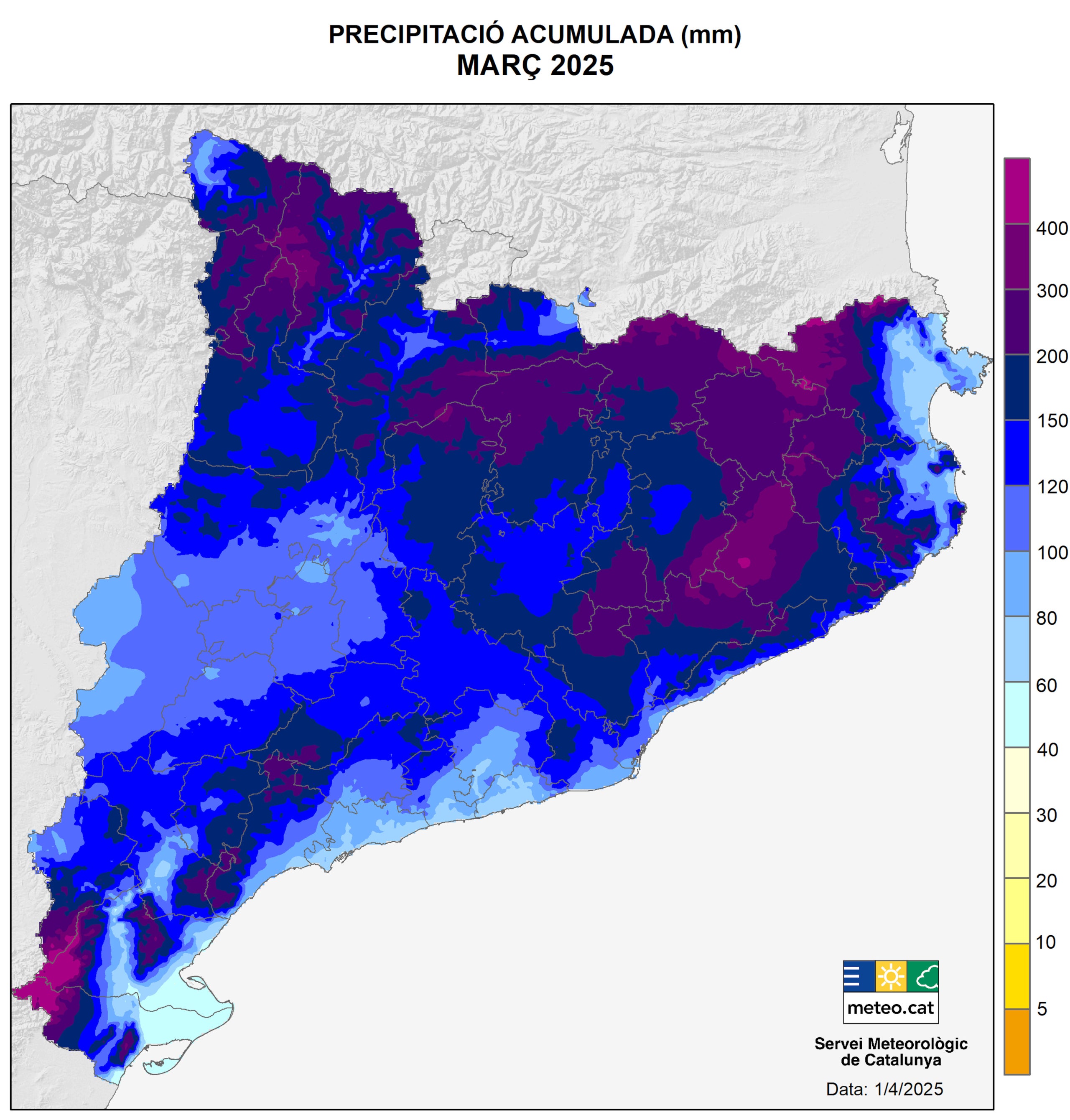 El mes de març de 2025 quedarà en el record de tots els catalans per la gran quantitat de pluja i l’augment espectacular dels embassaments. De fet, aquest mes de març ha estat el més plujós des de principis de segle i un dels més plujosos de la sèrie històrica, molt semblant al de 1974. En el balanç elaborat pel Servei Meteorològic de Catalunya (Meteocat) s’indica que, per altra banda, la temperatura màxima ha estat per sota de l’habitual. Cal anar fins al mes de gener del 2020 per poder trobar un mes tan plujós com ha estat aquest mes de març de 2025.